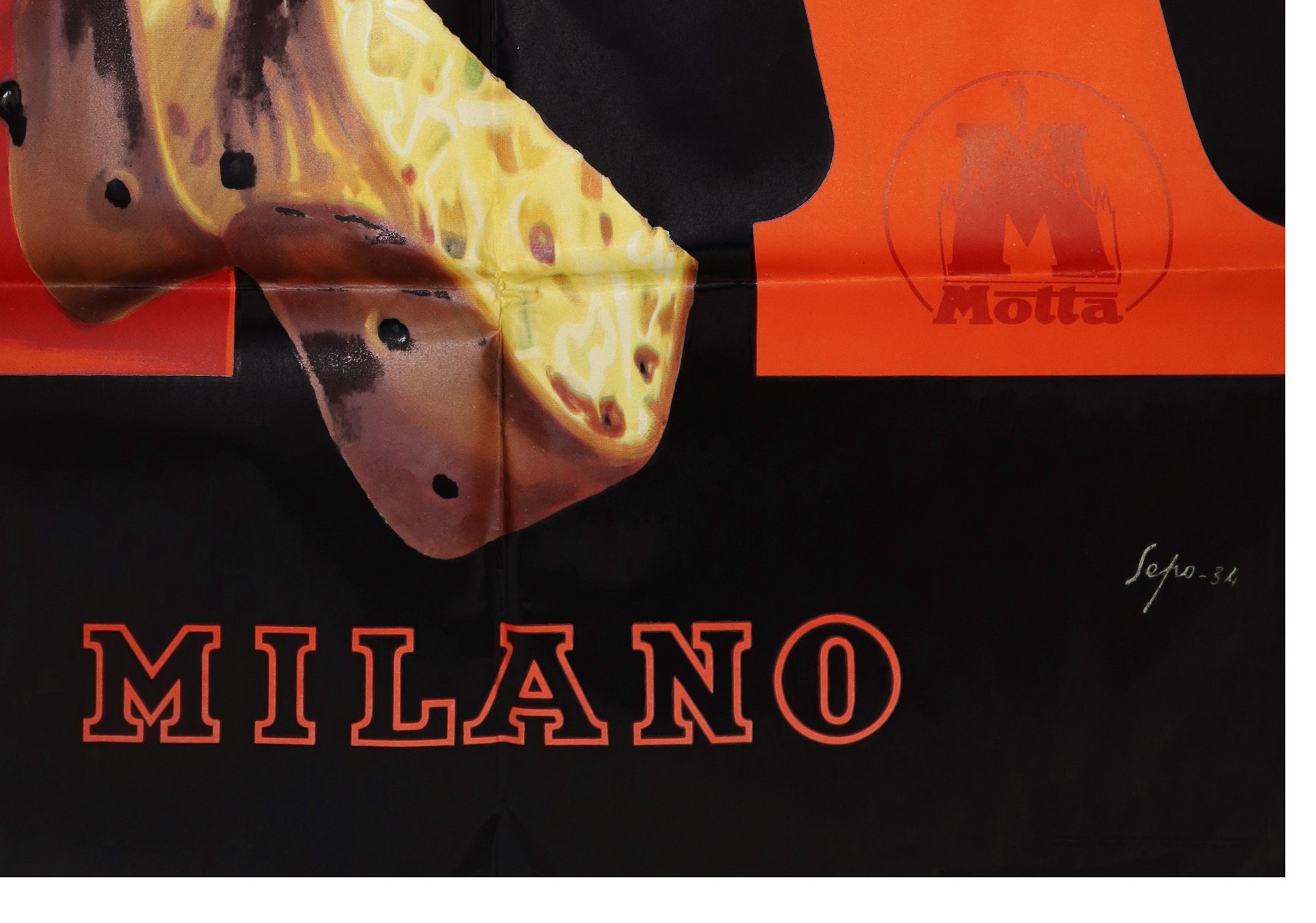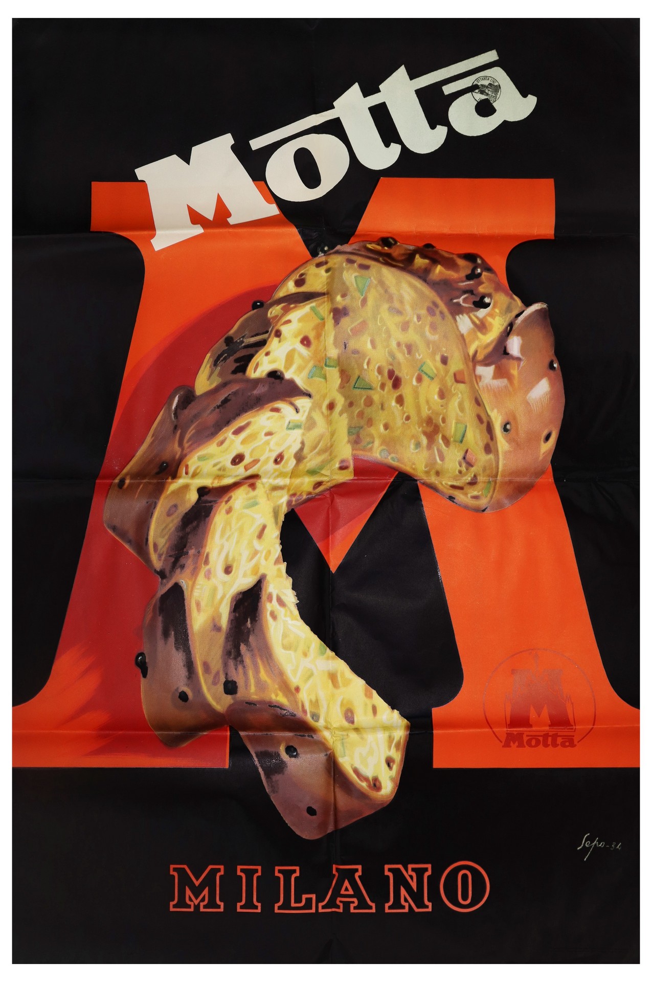 Severo Pozzati ''Sepo'' - Manifesto pubblicitario Panettone Motta, 1934 cm 100x70 Milano, firmato in basso a destra Sepo-34. Tracce di acqua sul retro.