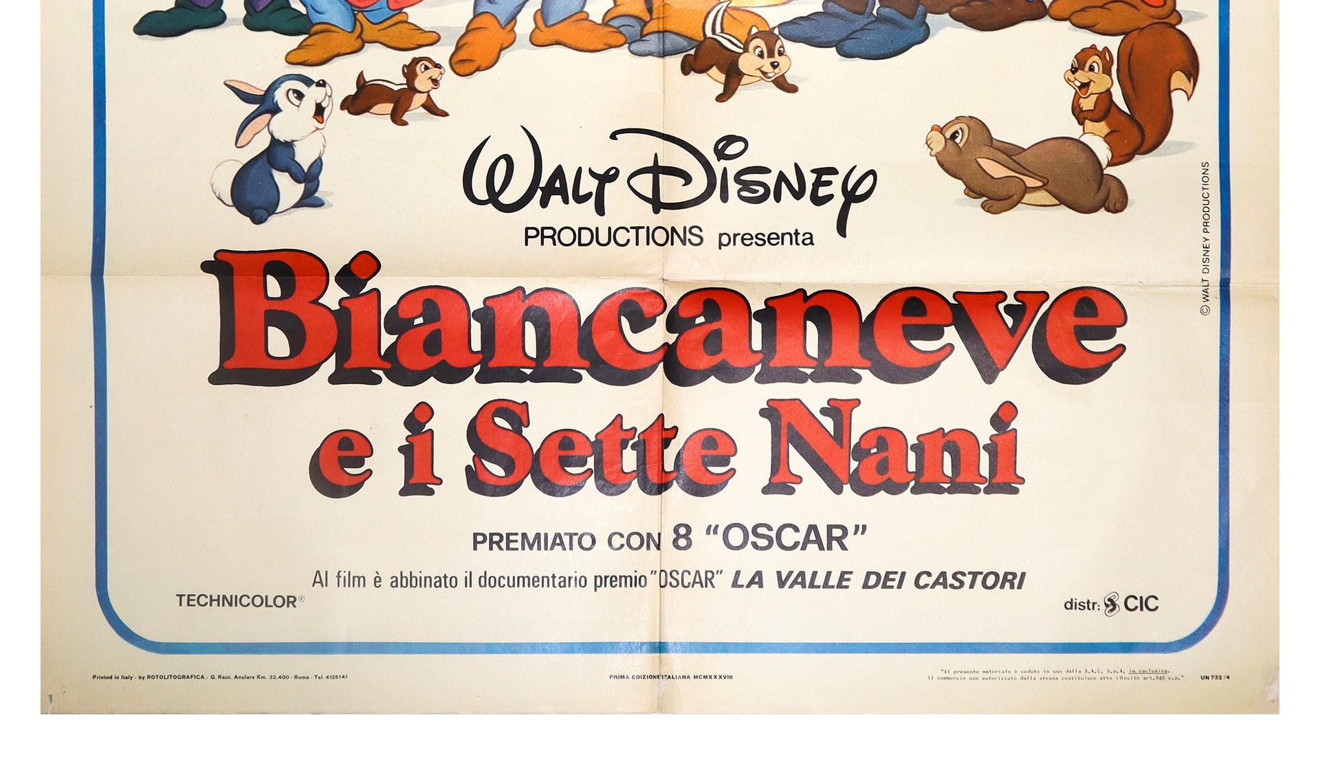 Manifesto cinema due fogli ''Biancaneve e i sette nani'', 1938 cm 140x100 Seconda edizione, printed in Italy by Rotolitografica - Roma, normali segni d'uso, presente nastro sul retro