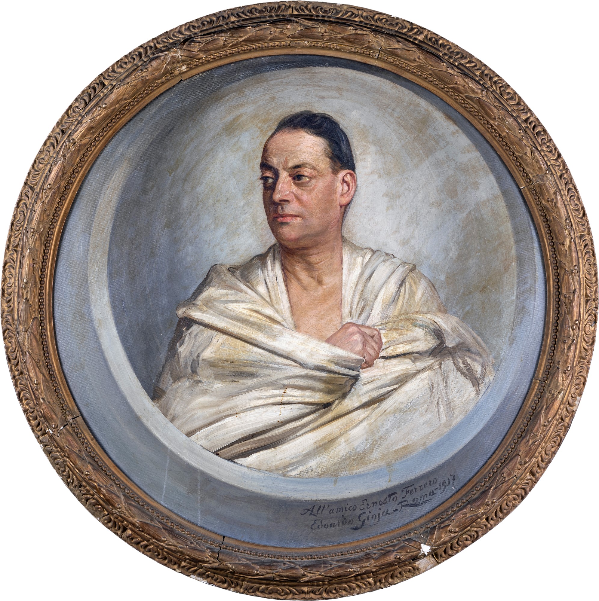 Firma, dedica e data "All'amico Ernesto Ferrero, Edoardo Gioia, Roma 1917". Misure in cornice cm 112 Ø