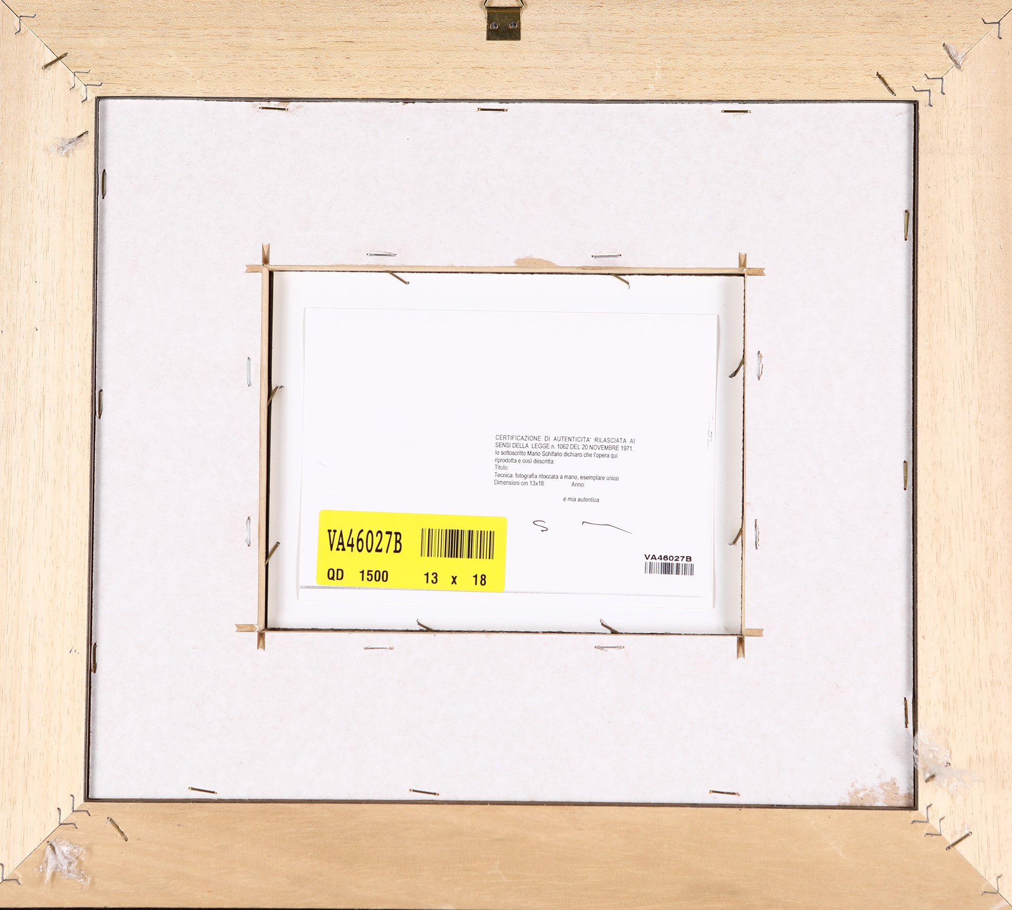 Certificato di autenticità rilasciato nel 2007 dalla Fondazione Mario Schifano