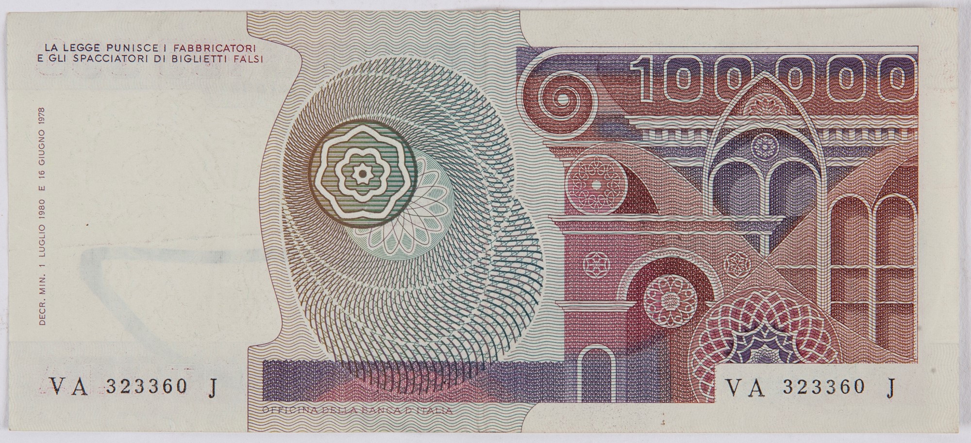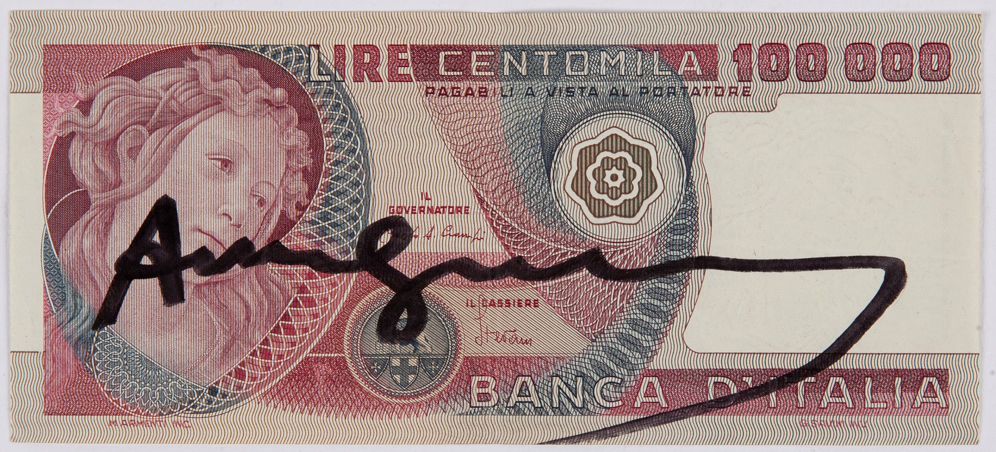 Andy Warhol (Pitsburg, 1928 - New York, 1987) Centomila Lire cm 7x15,5 Firma...