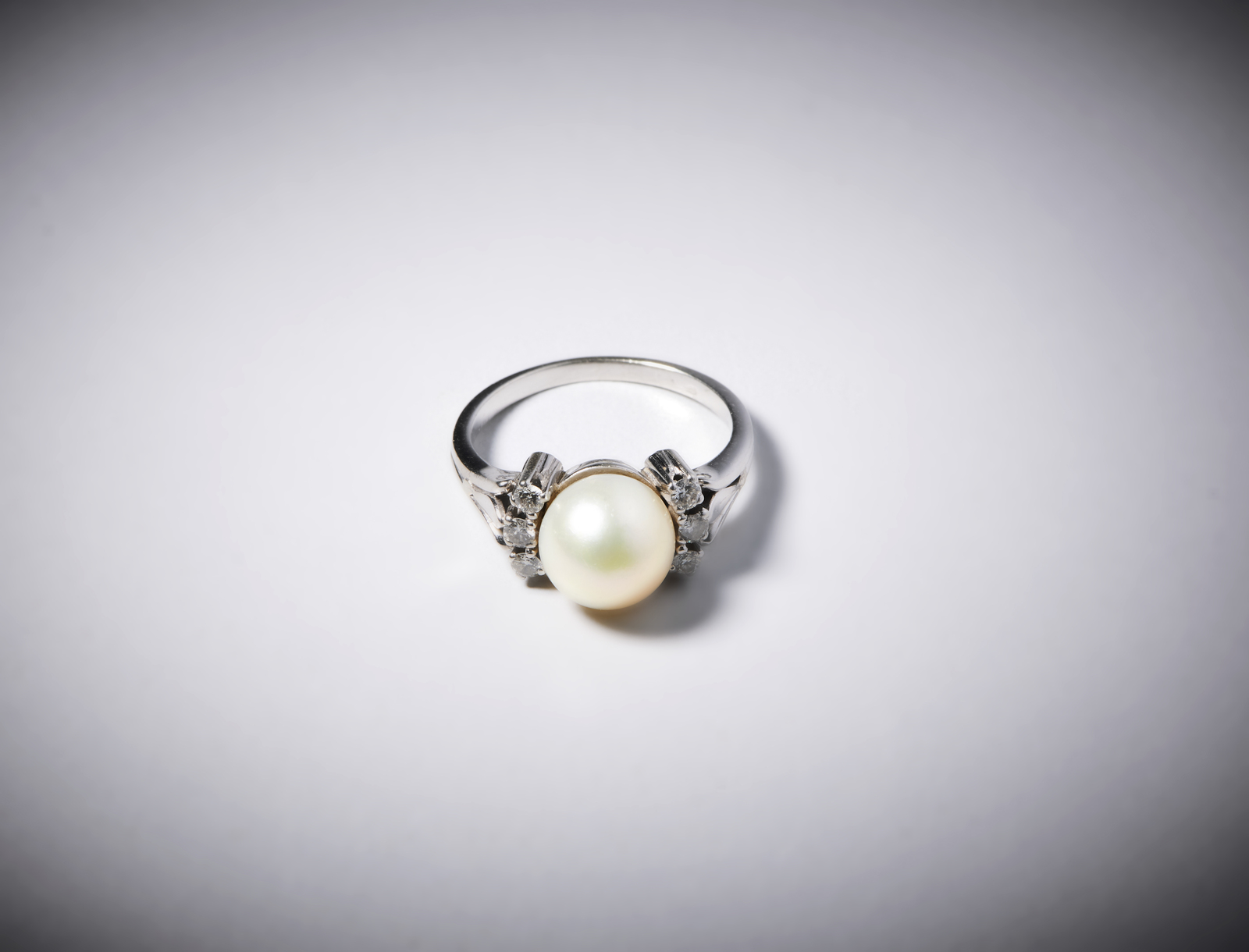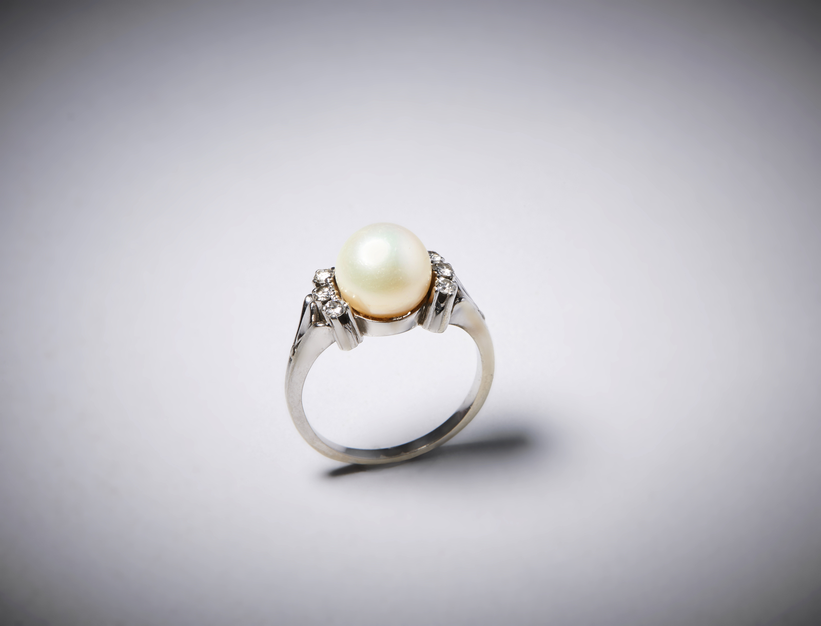 Lot 2 | . - Anello in oro bianco 750/1000 con perla sferica e brillantini taglio huit huit di circa 0,40 ct.