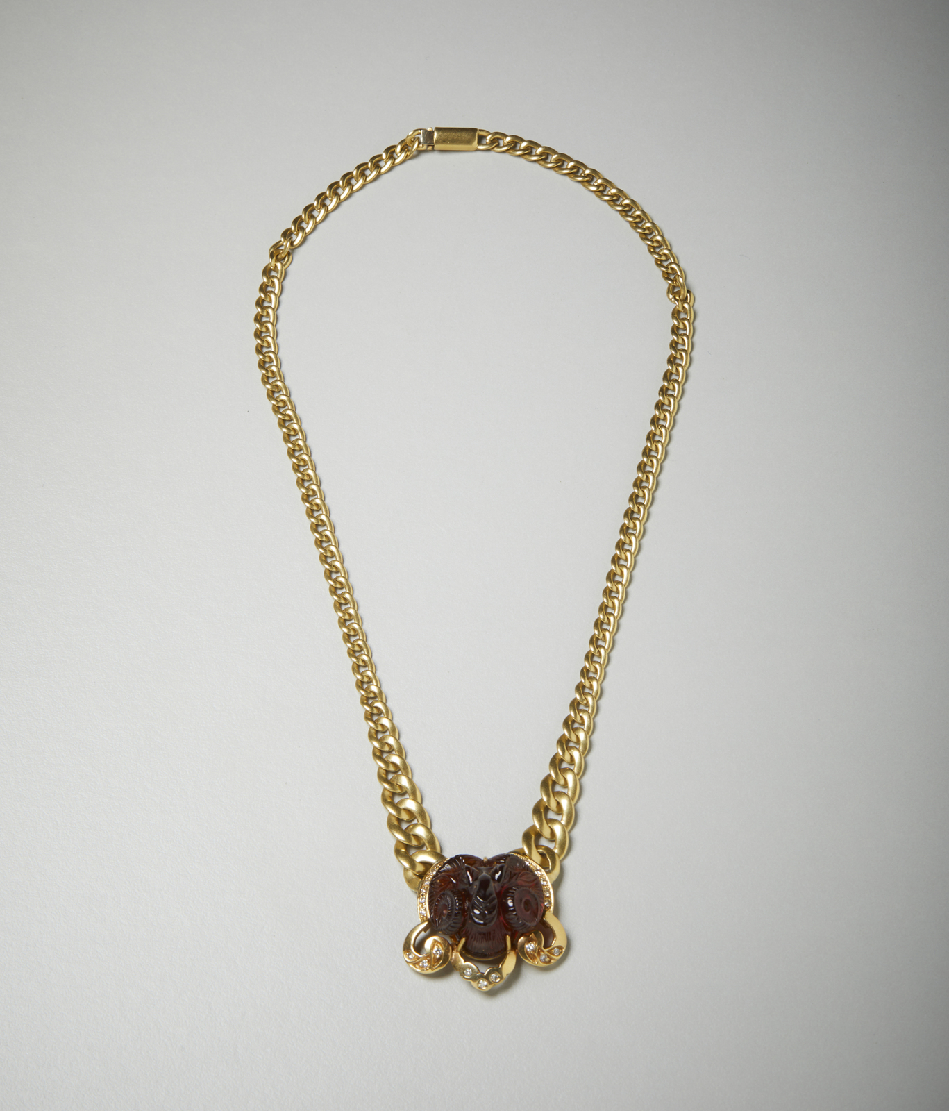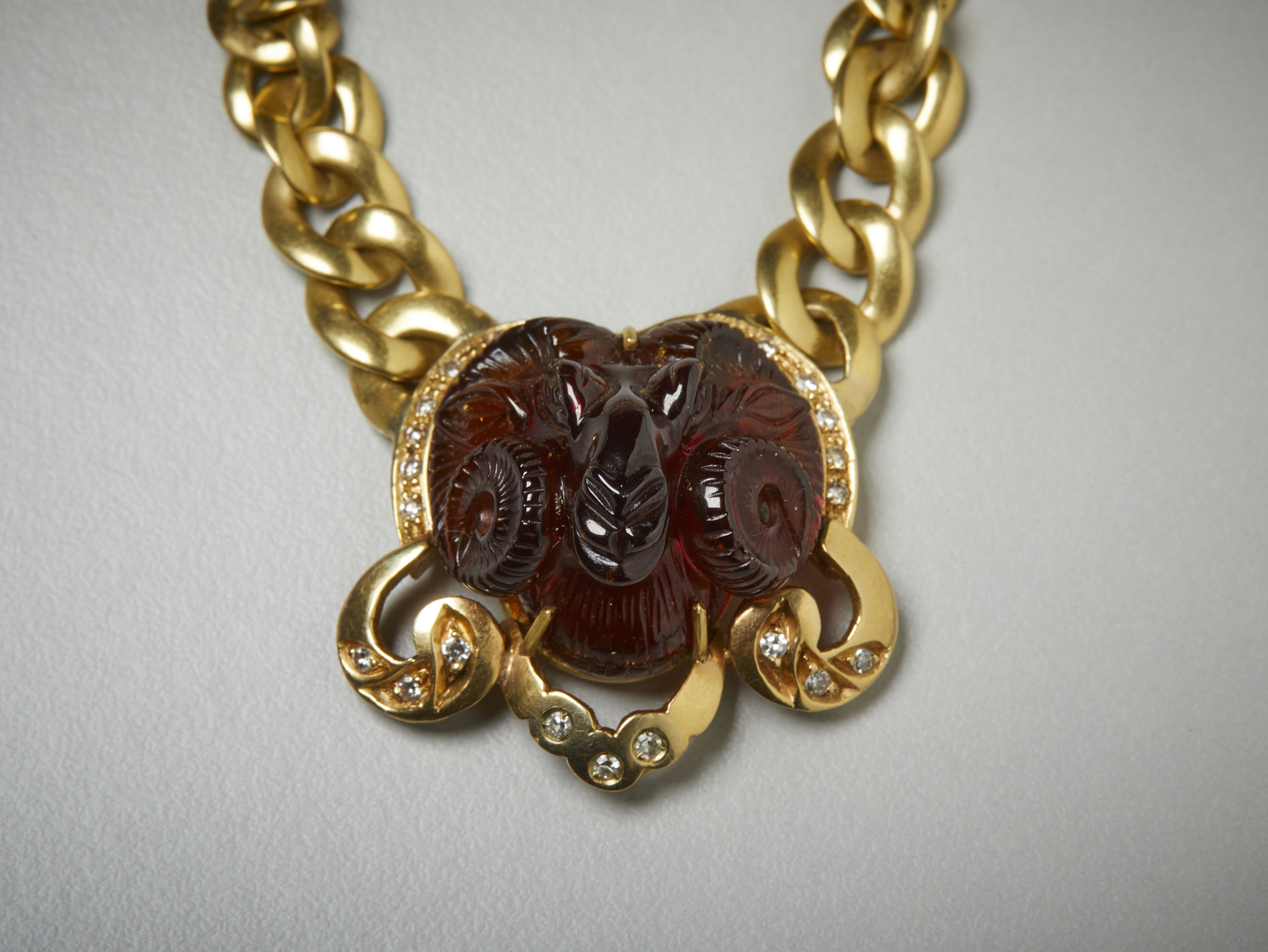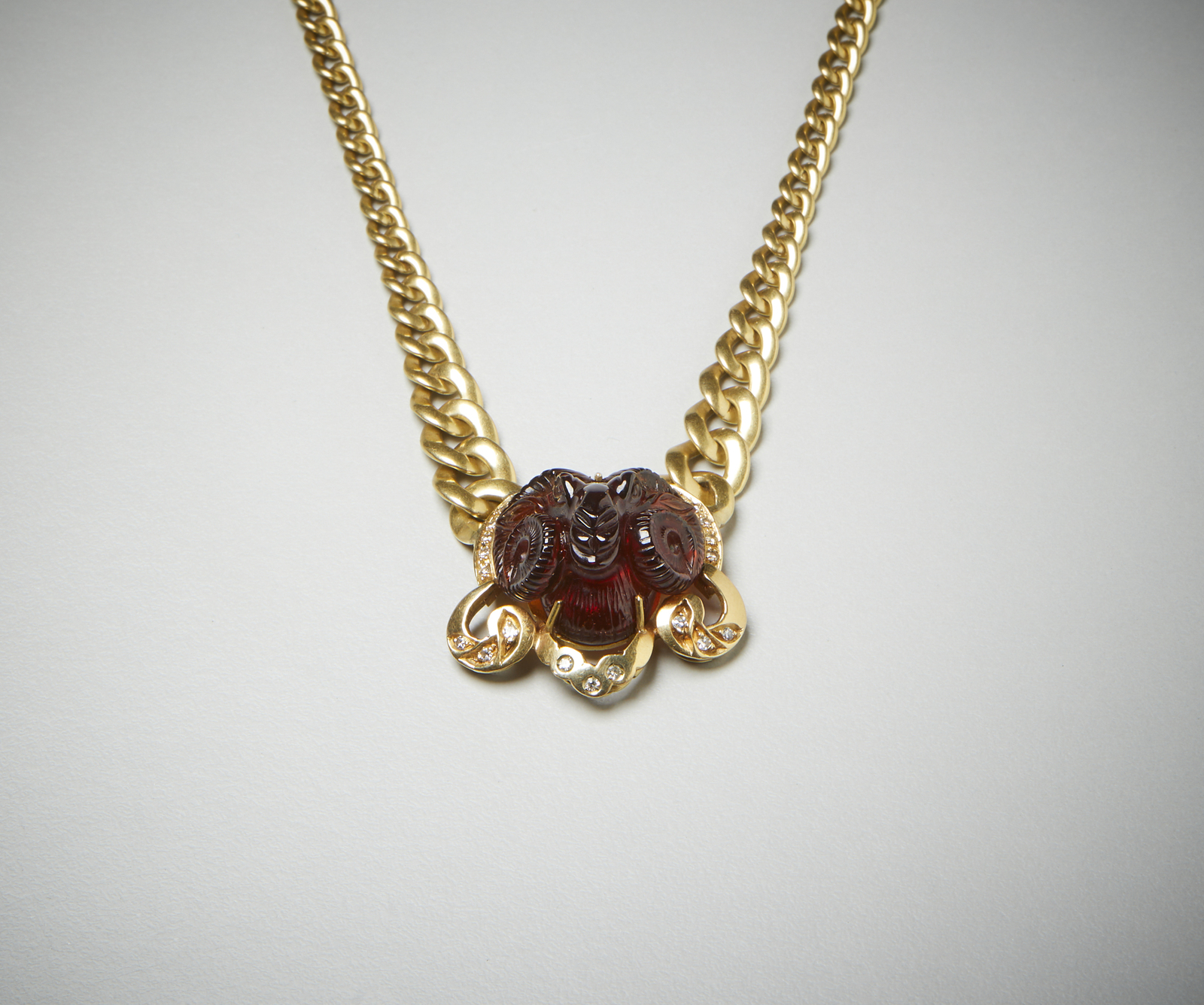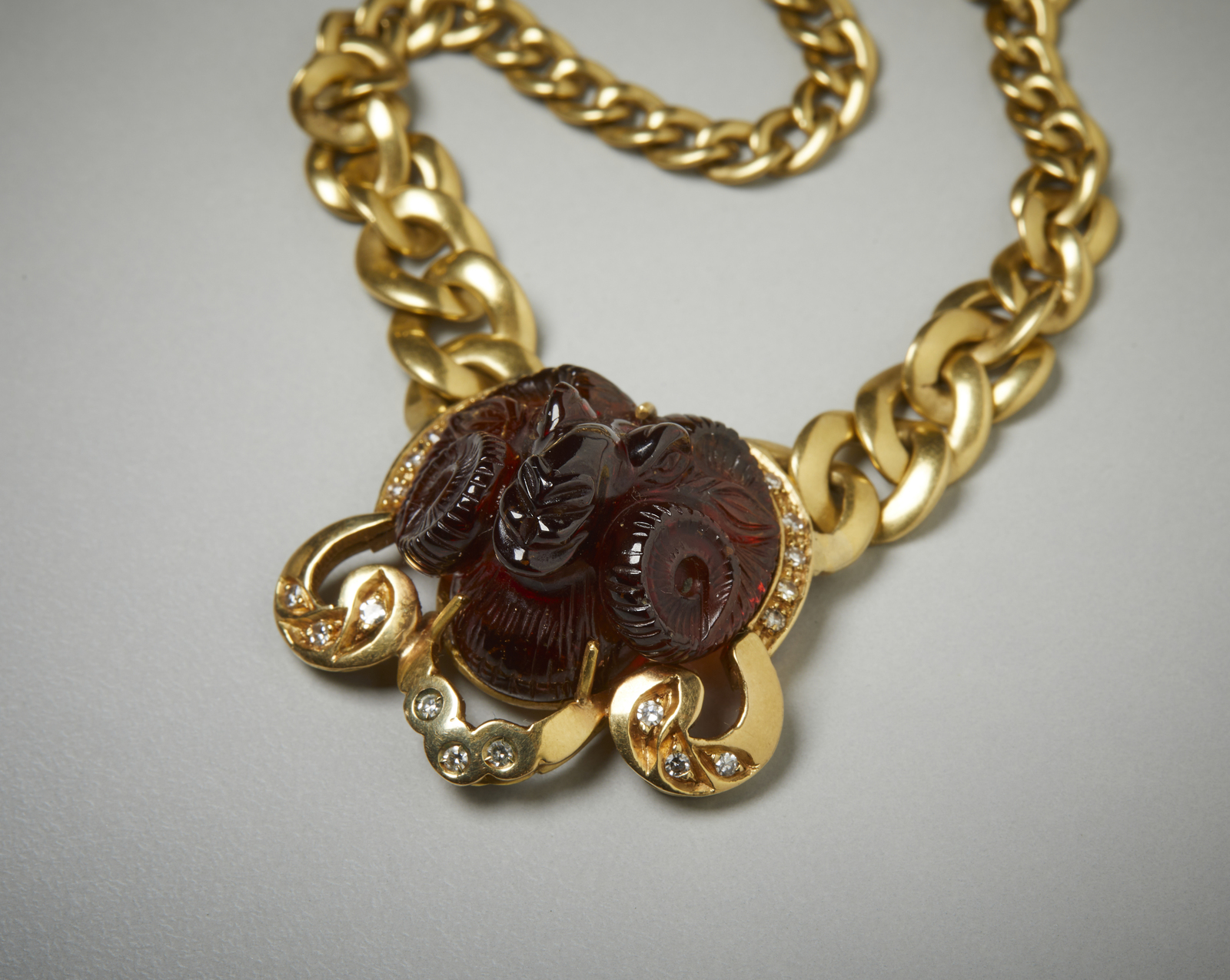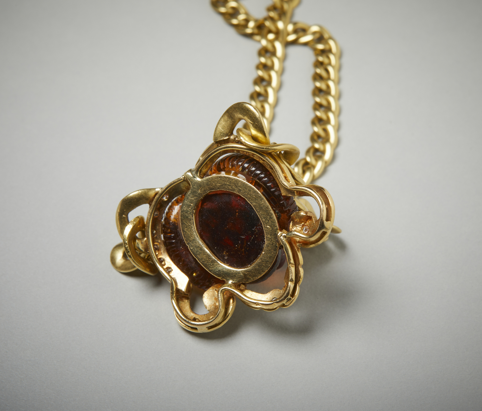 . Collier in oro giallo 750/1000 con corniola incisa e diamantini. . . .