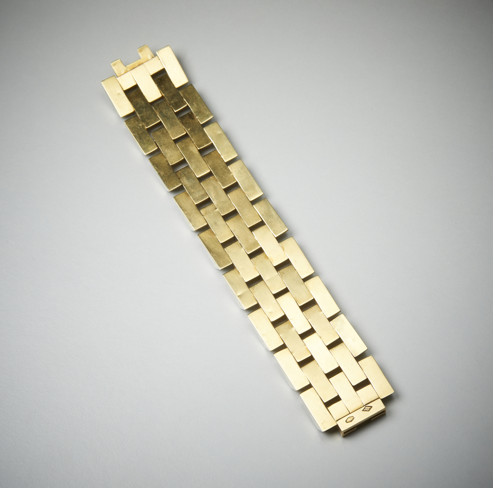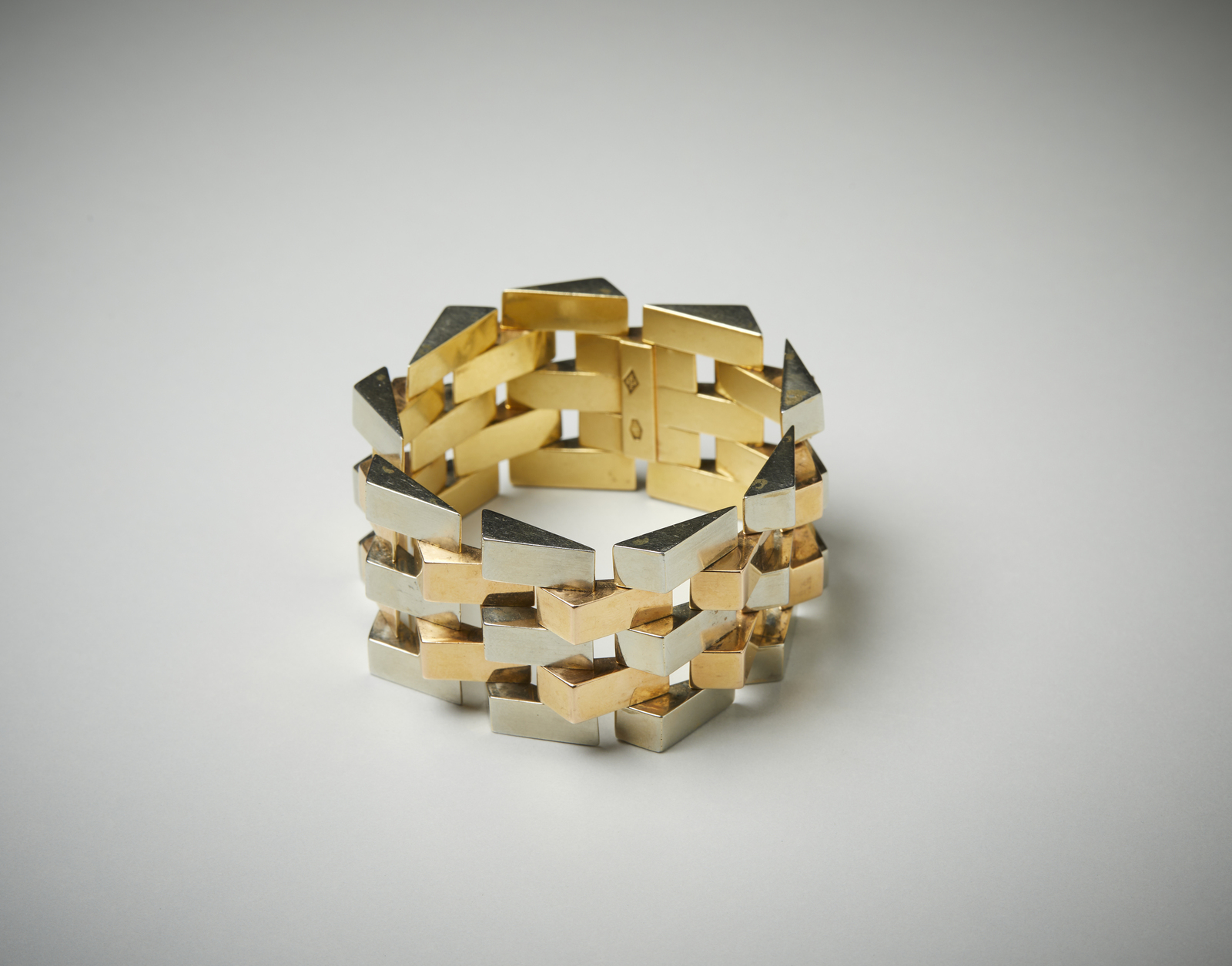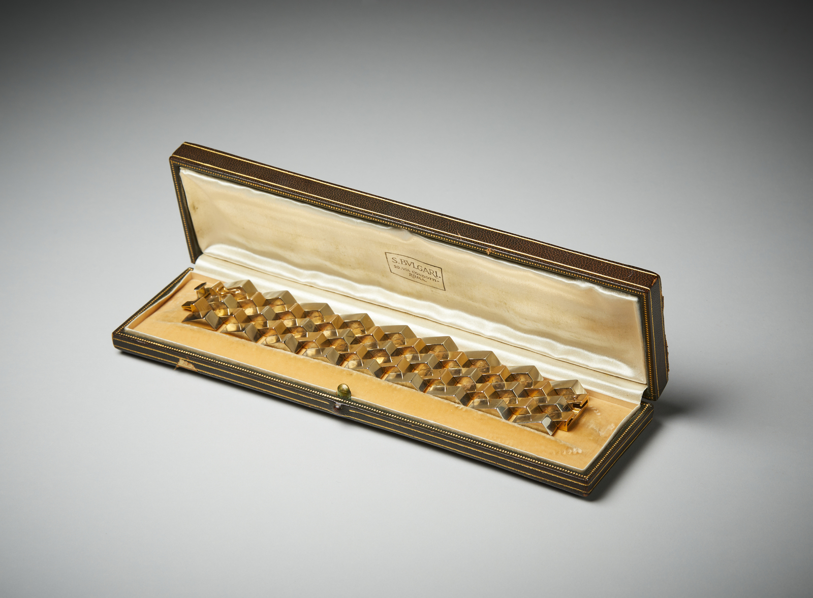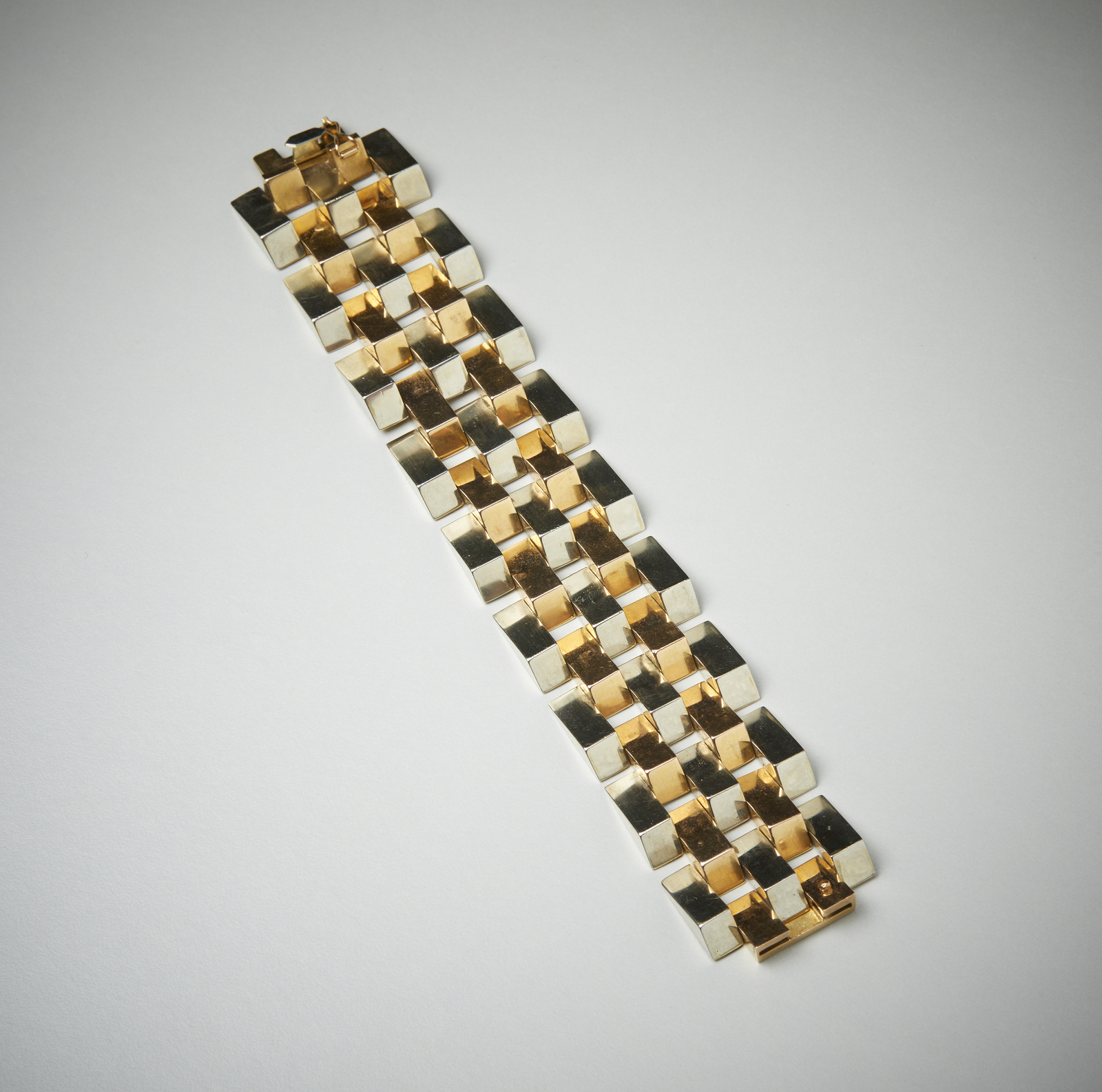 . Braccialetto in oro bianco e giallo 750/1000. . . Cm 19,00 x 3,40. Importante braccialetto in oro giallo 18 carati, di gusto scultoreo, realizzato a metà del XX secolo. Corredato di scatola firmata S. Bulgari.