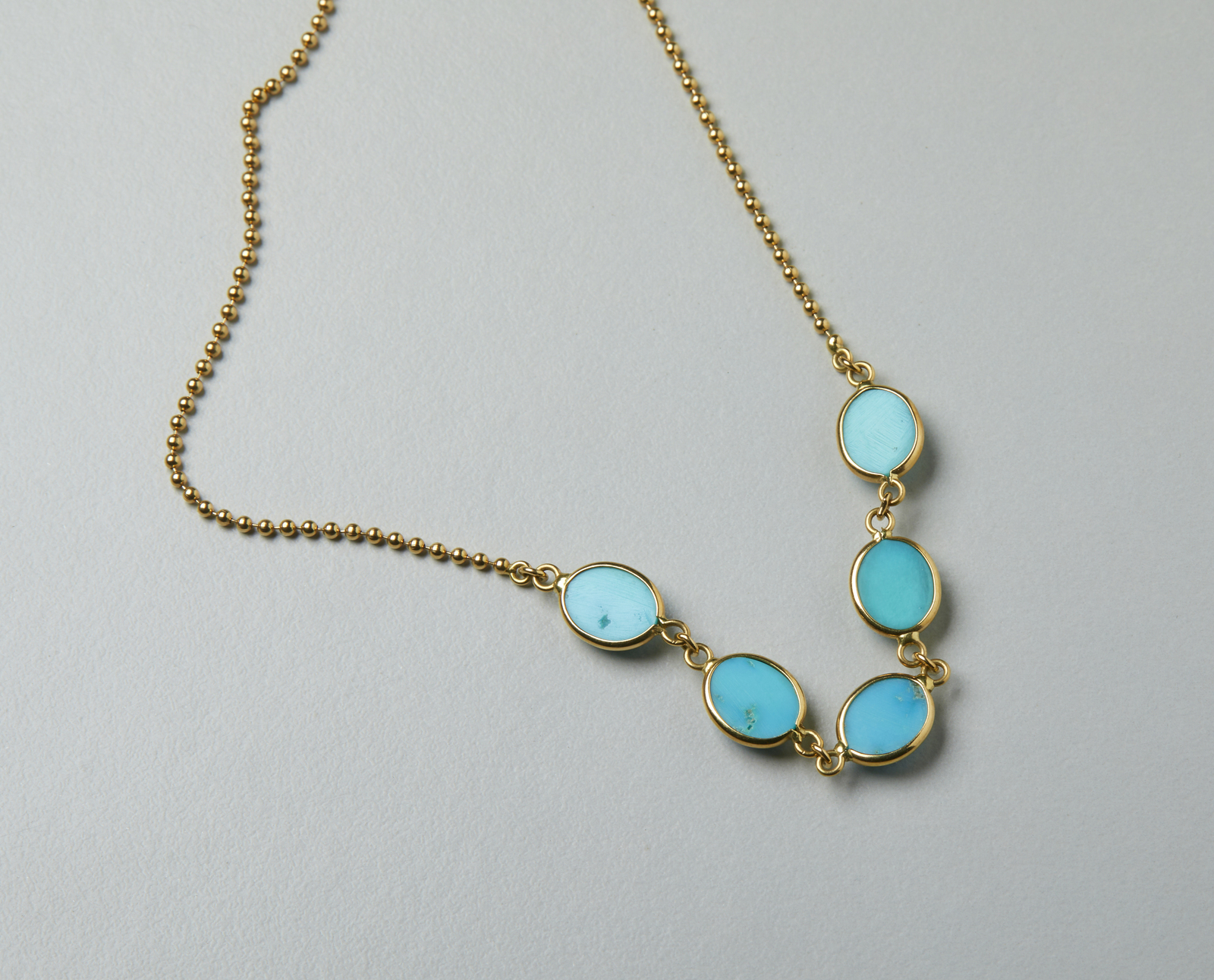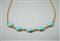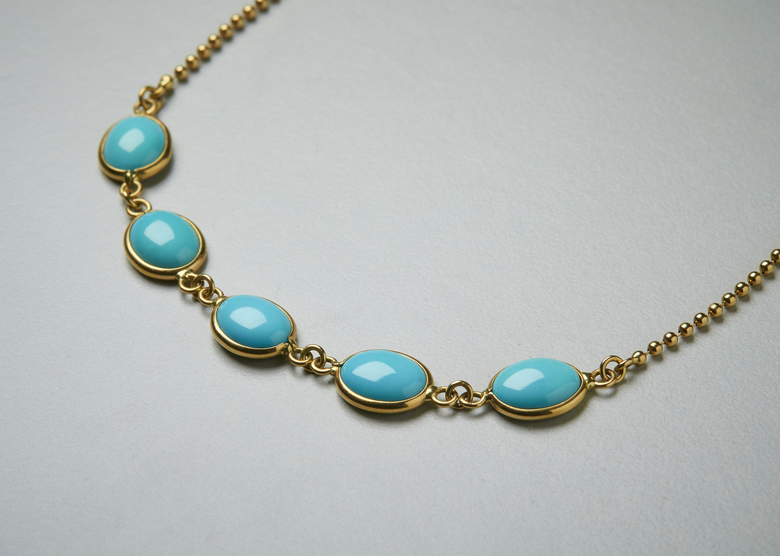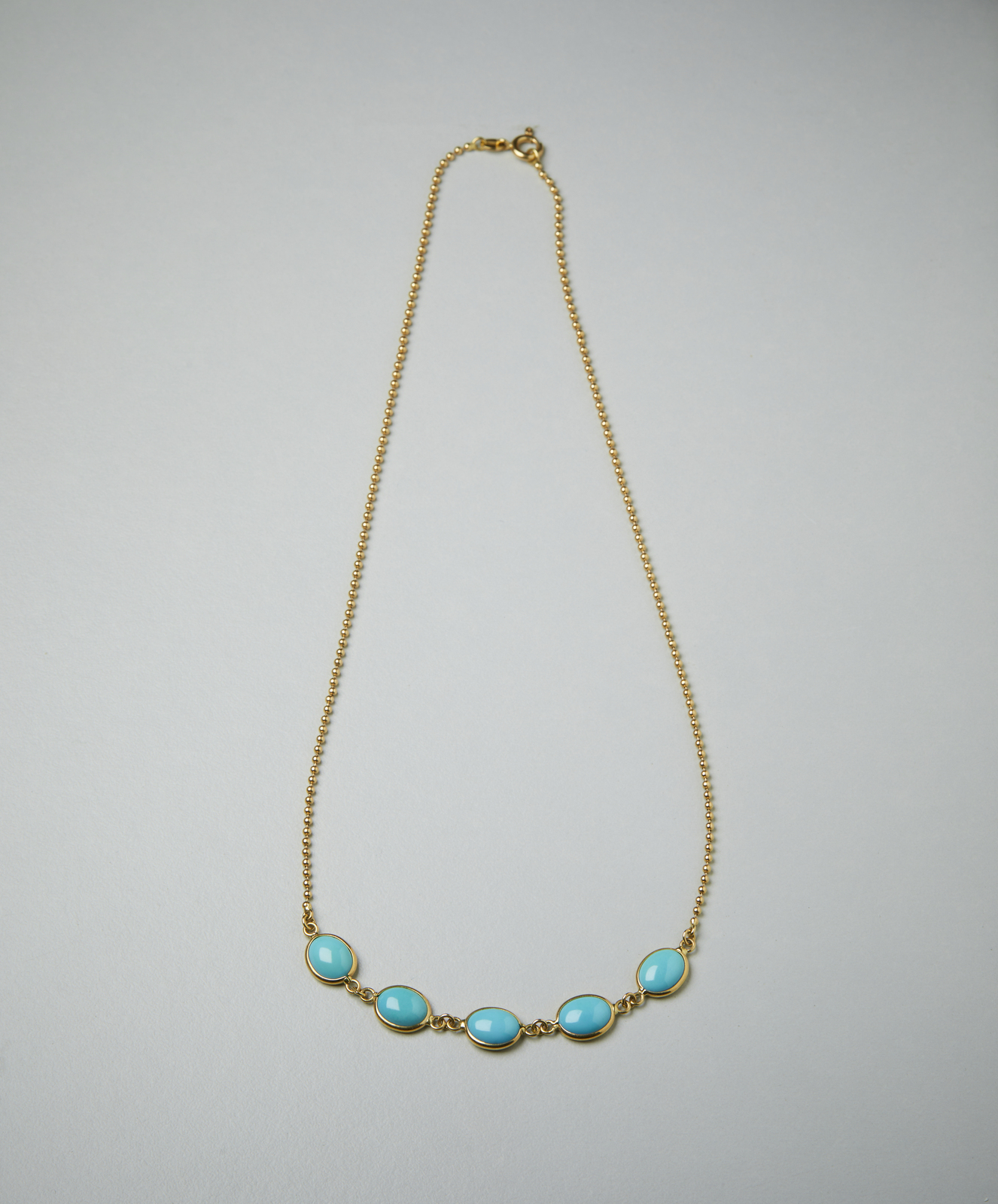 . - Collanina in oro giallo 750 con cinque turchesi ovali cabochon. .