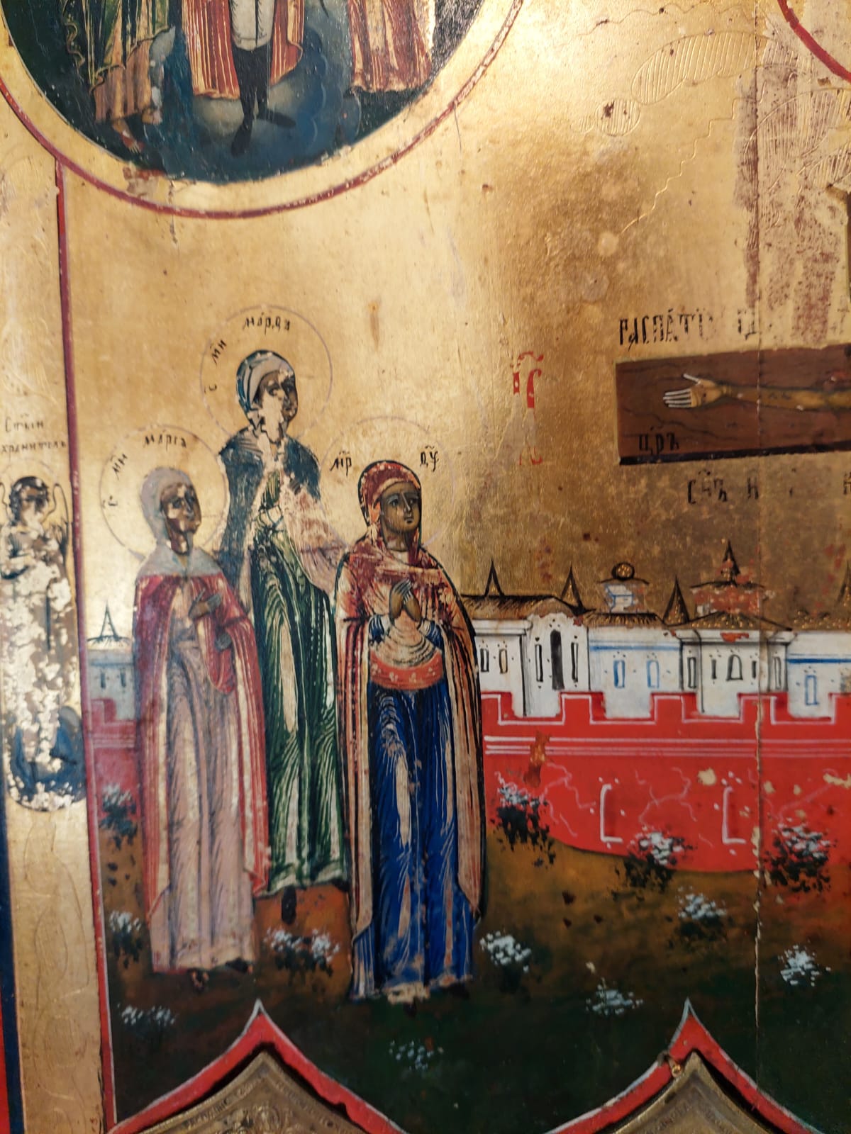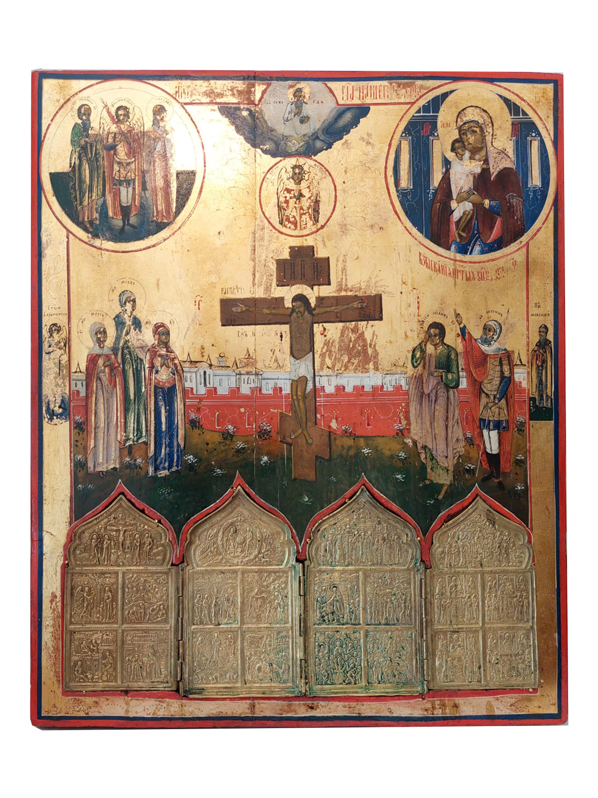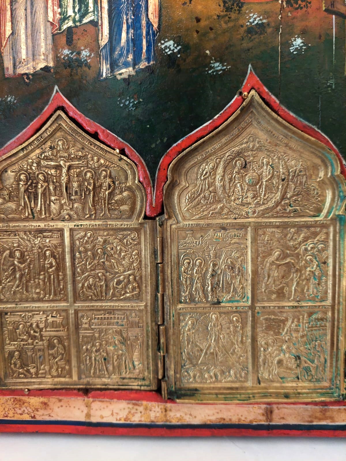 Nel registro inferiore troviamo una grande icona da viaggio realizzata in bronzo con cornice semplice sagomata e smalti policromi, composta di quattro pannelli raffiguranti le Sedici feste ortodosse.