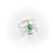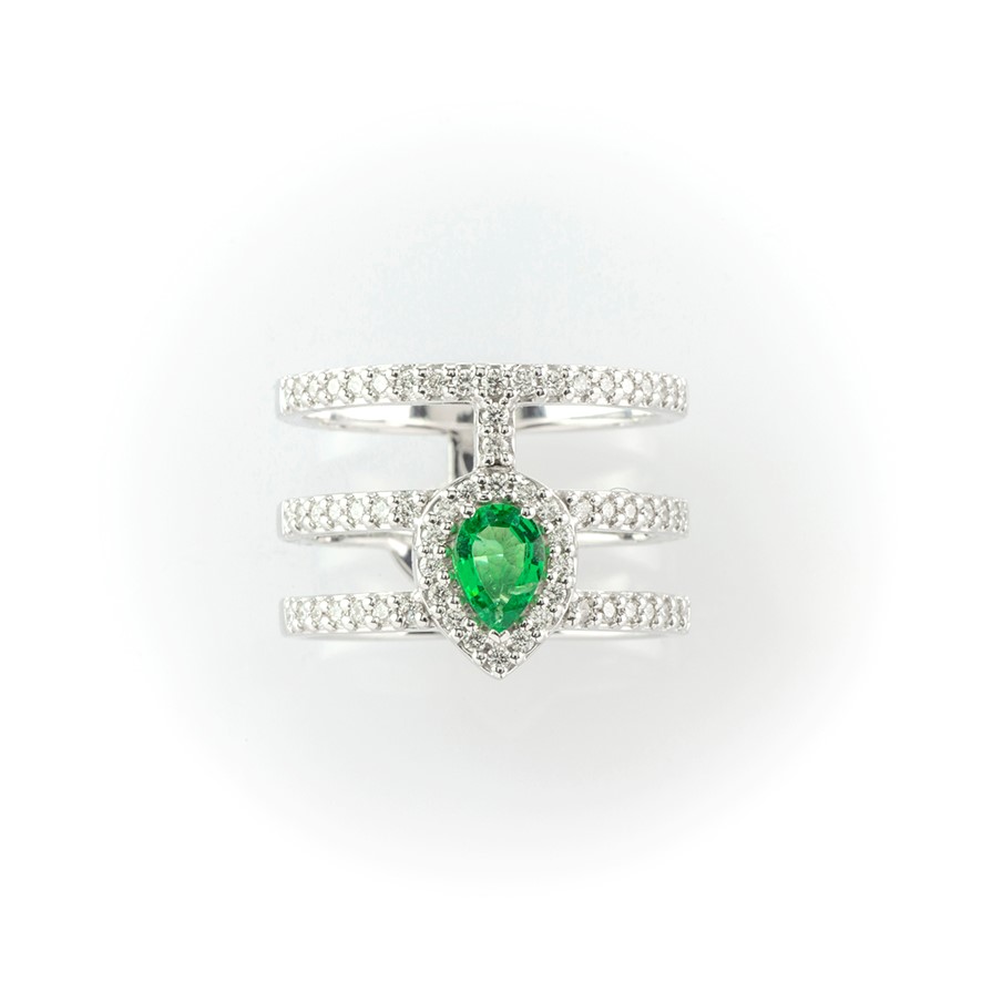 Anello a fascia in oro bianco con diamanti bianchi e smeraldo centrale taglio a goccia