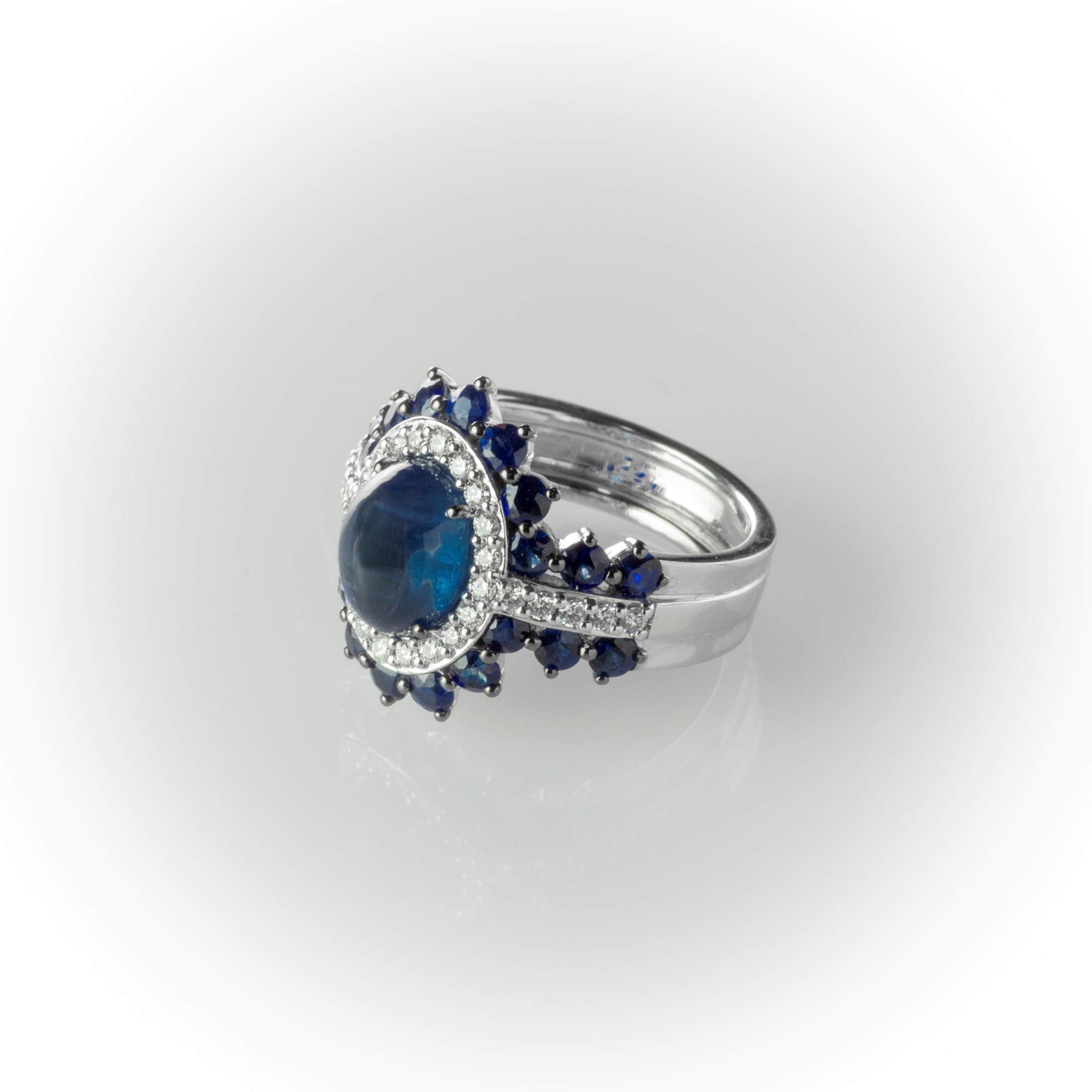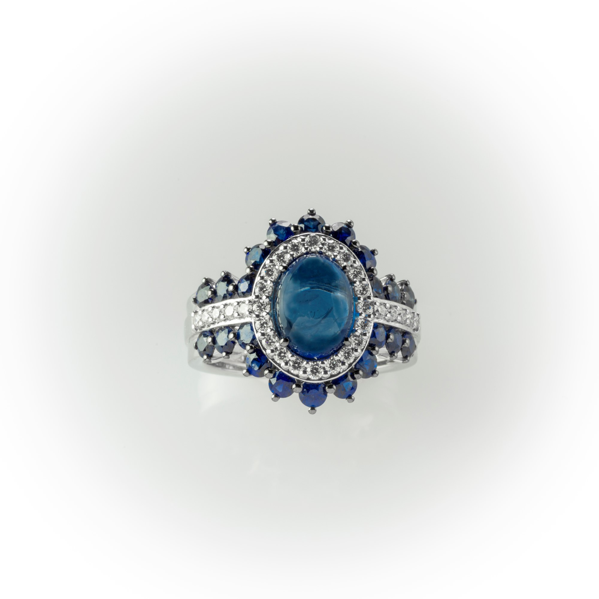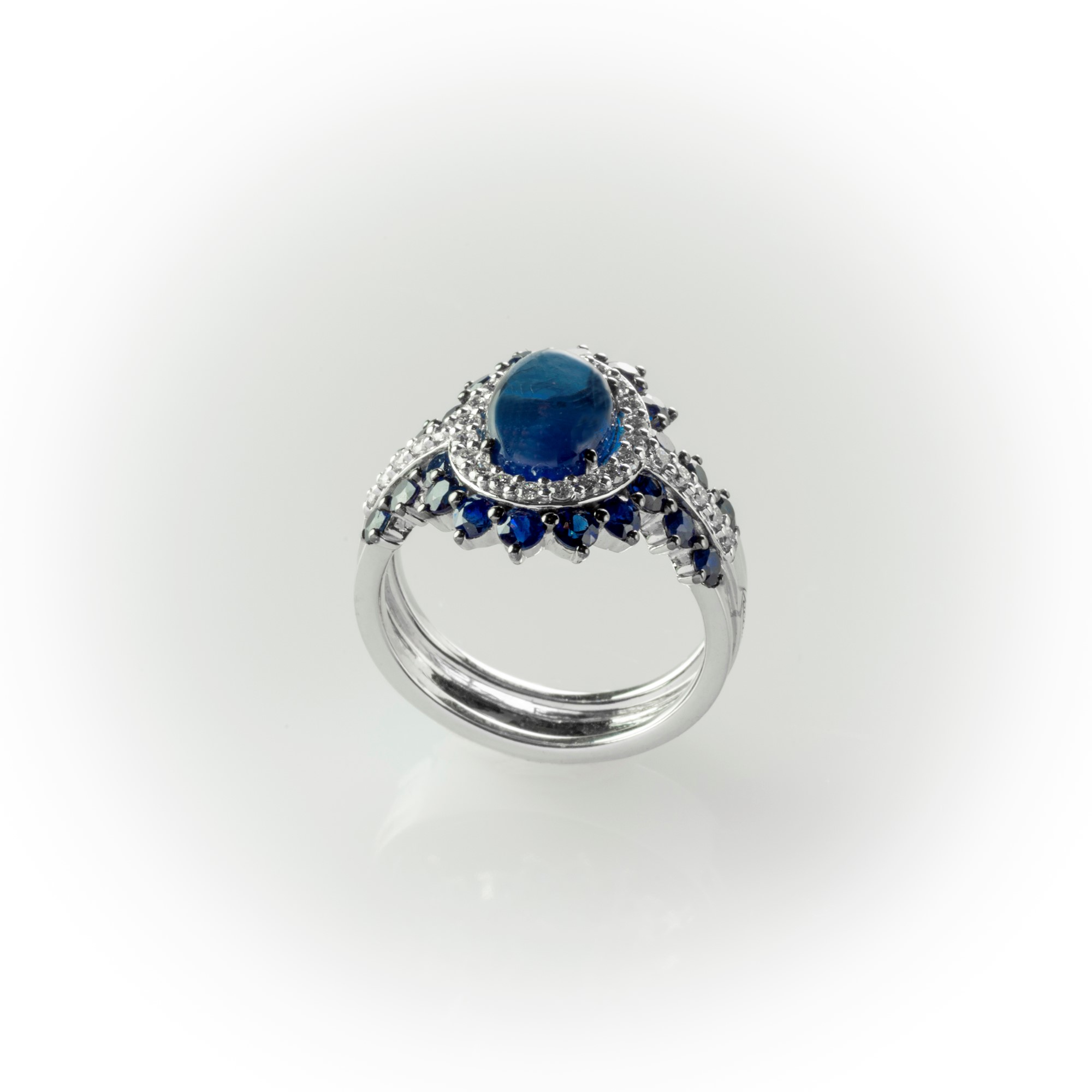 Anello Recarlo in oro bianco con cabochon centrale di zaffiro blu e zaffiri di contorno, con diamanti bianchi taglio brillante