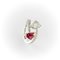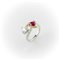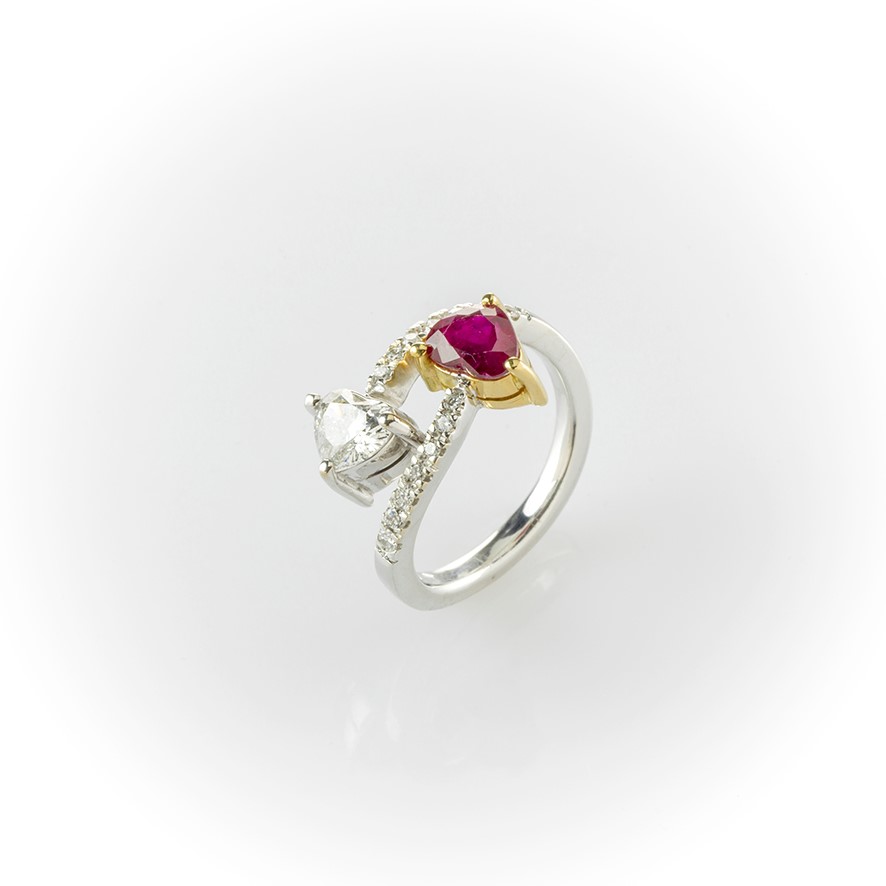 Anello contrariè in oro bianco e giallo con un diamante e un rubino taglio a cuore contrapposti e pavè di diamanti sul gambo