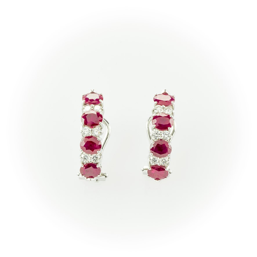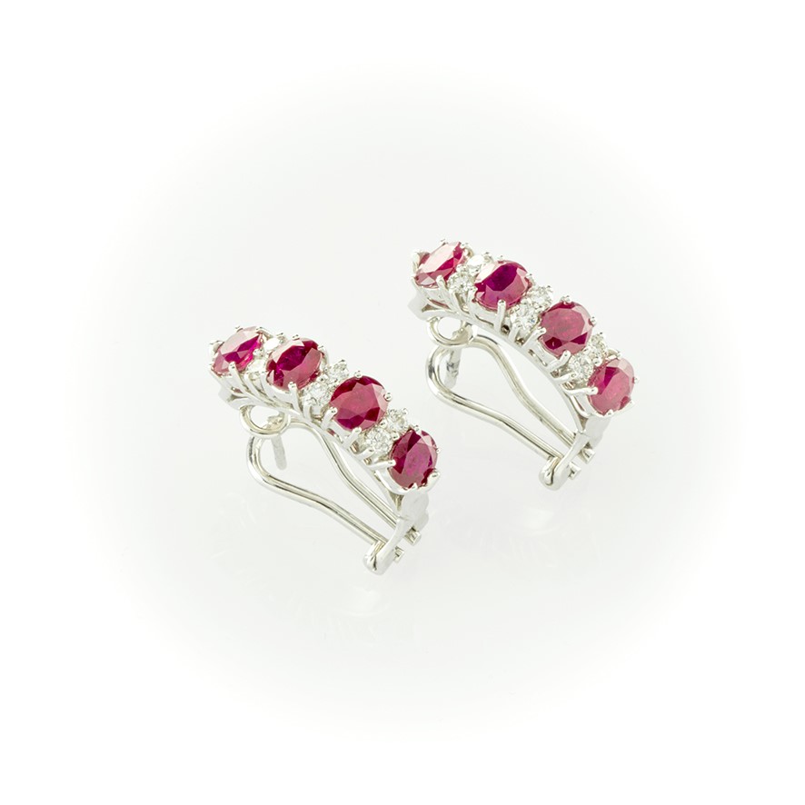 Orecchini girolobo in oro bianco con rubini taglio ovale e diamanti taglio brillante