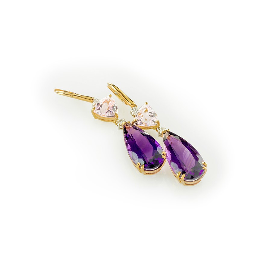 Orecchini in oro rosa con grande ametista a goccia, kunzite e diamanti bianchi taglio brillante