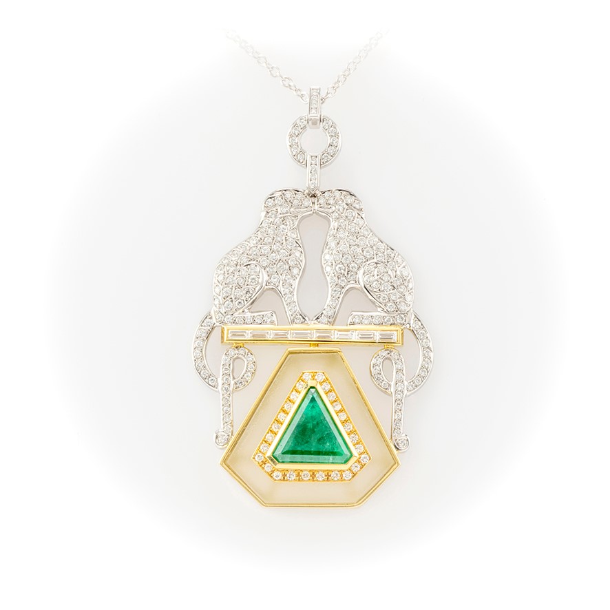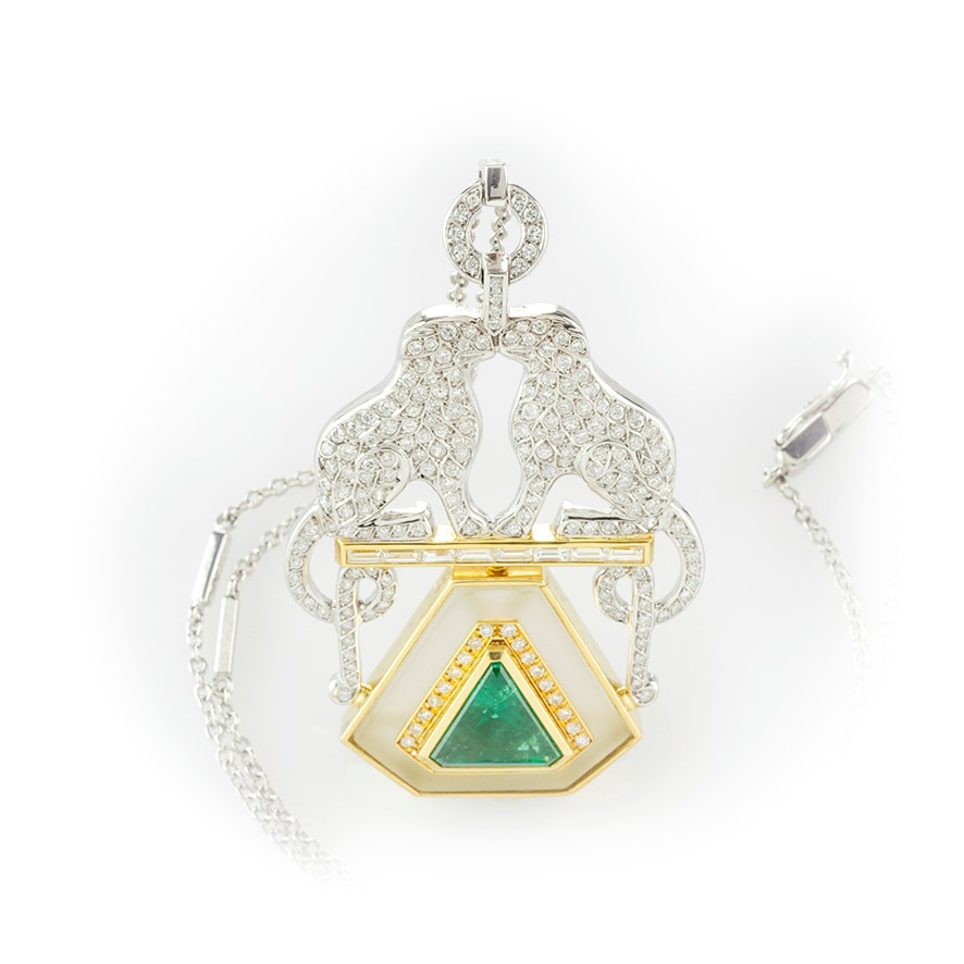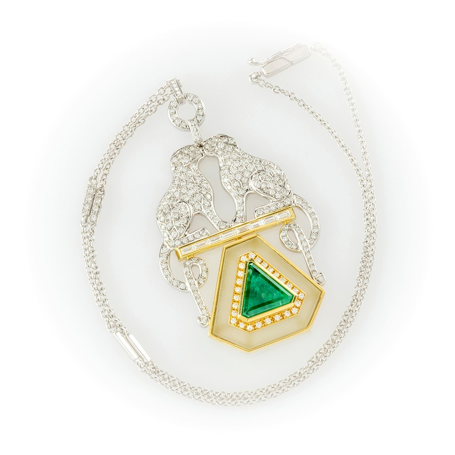 Completano la fantasia del gioiello una linea di 8 diamanti taglio baguette ed uno smeraldo con esclusivo taglio a triangolo su base di cristallo di rocca, Piccoli elementi con diamanti taglio brillante impreziosiscono la catenina per un totale di 243 pietre.