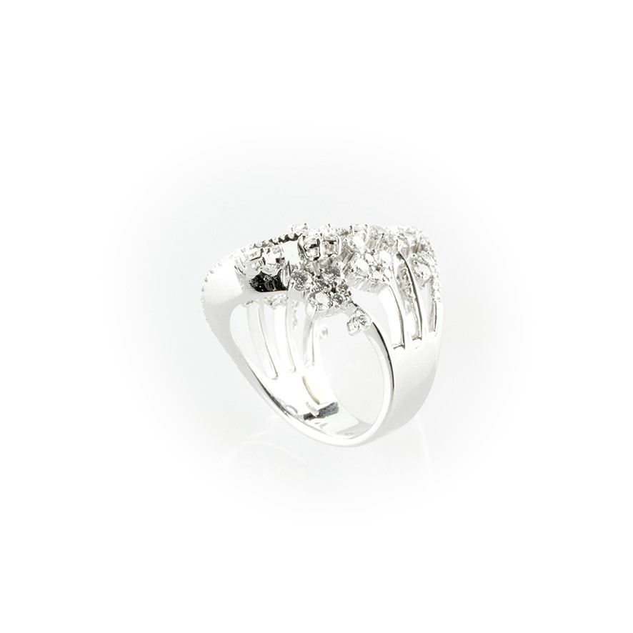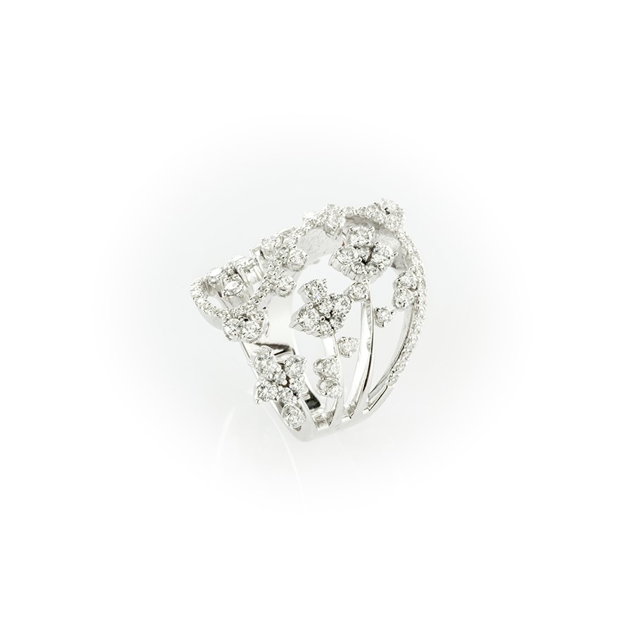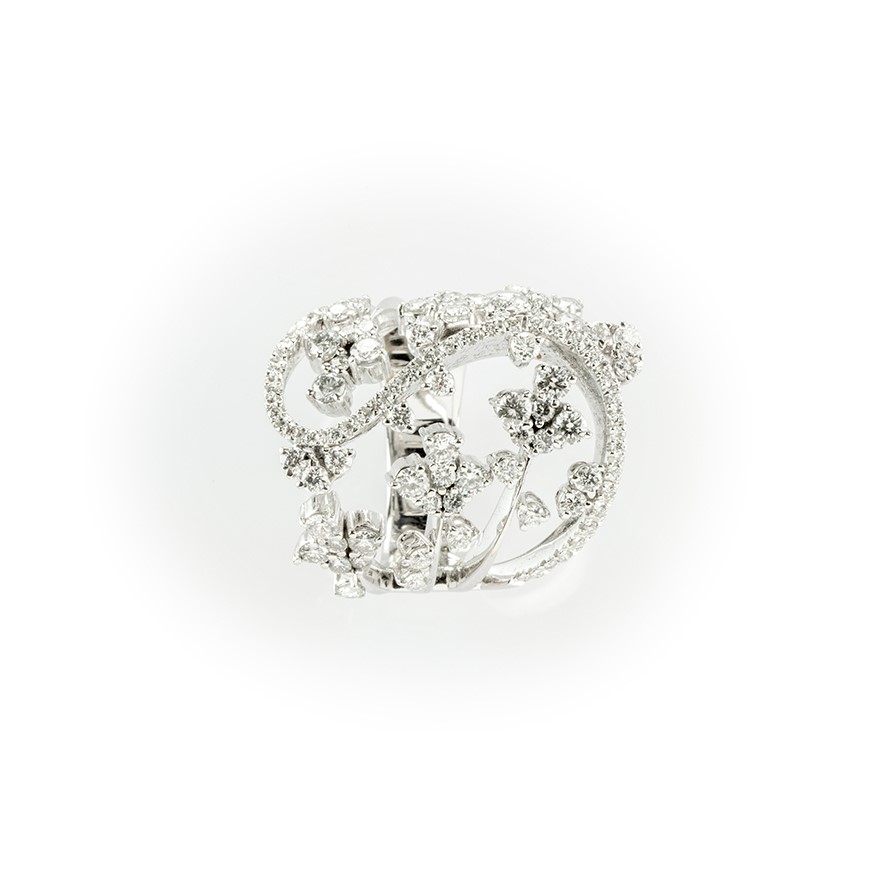 Anello fantasia realizzato con elementi floreali in oro bianco e diamanti bianchi taglio brillante