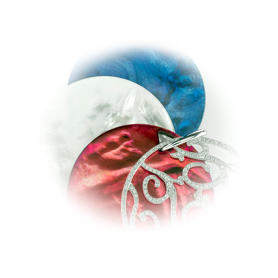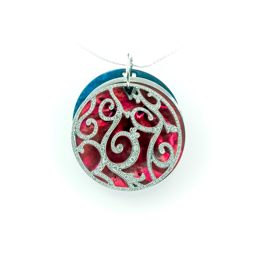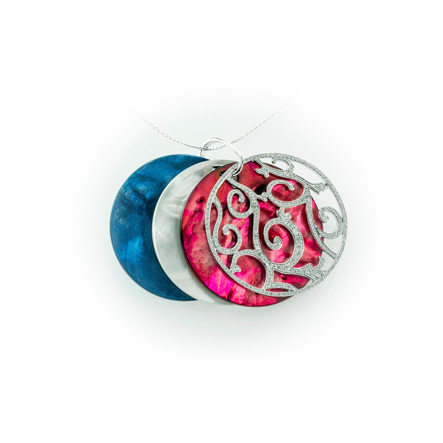 Collana Gismondi con particolare pendente a traforo in oro bianco e diamanti ice Mattioli. Ciondolo con lavorazione a traforo che lascia intravedere dischi in madreperla naturale, rossa e blu e un disco in oro bianco con fantasia di diamanti bianchi