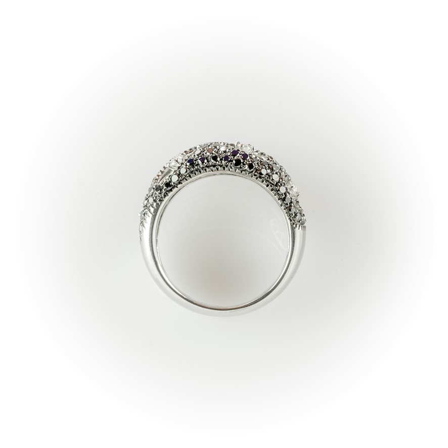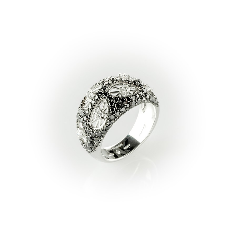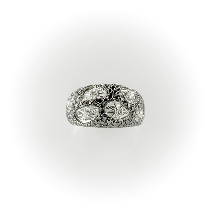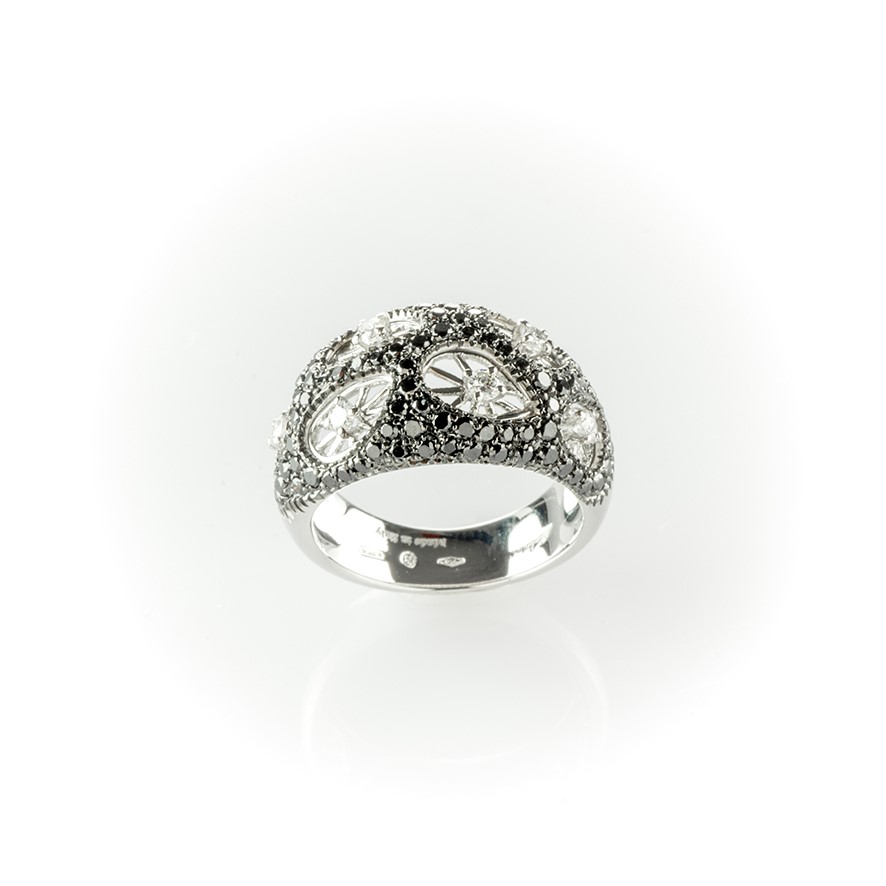 Anello a fascia Salvini in oro bianco con particolare manifattura costituita da diamanti bianchi taglio brillante inseriti in inserti forati su pavè di diamanti neri