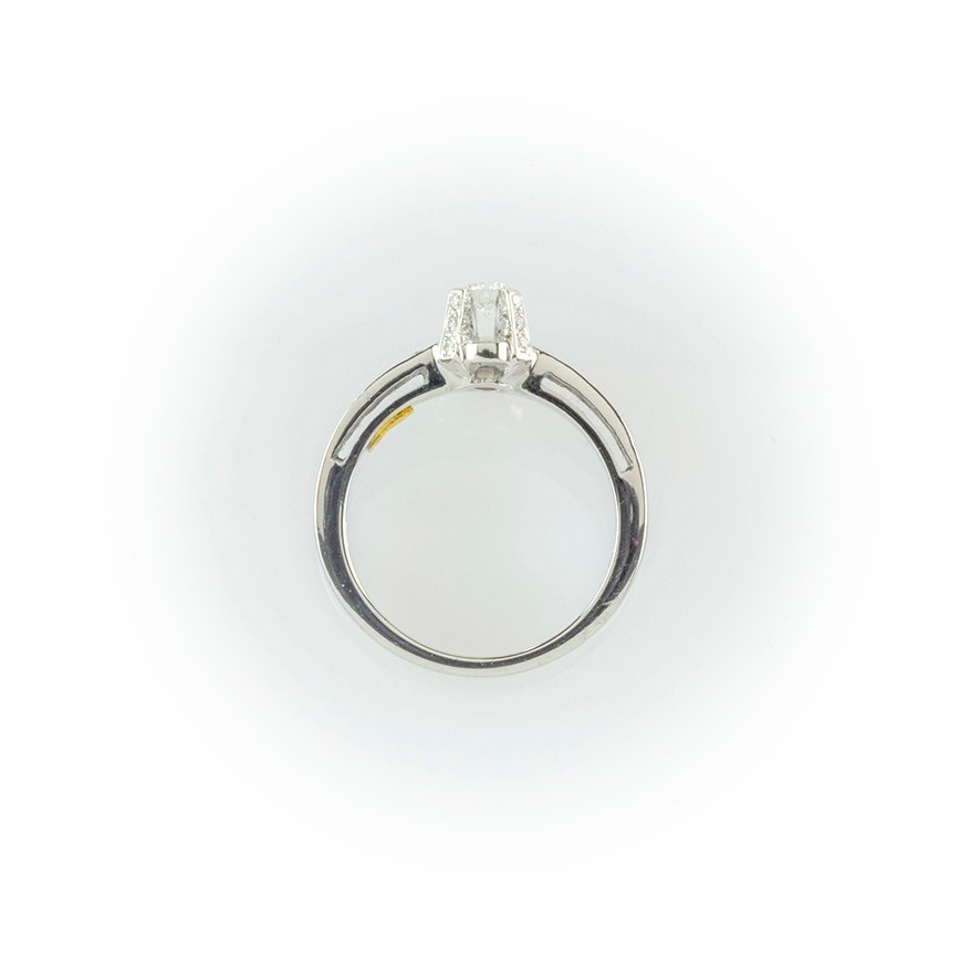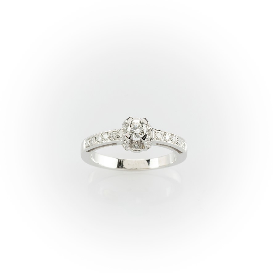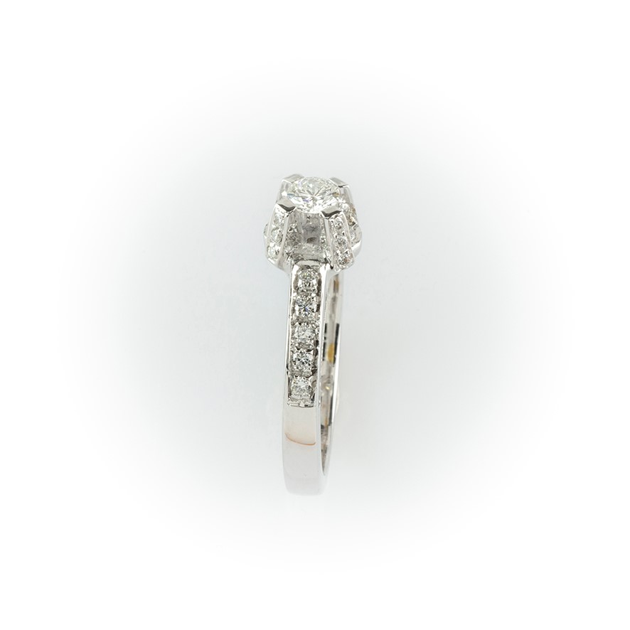 Anello in oro bianco con diamante centrale taglio brillante e pavè di diamanti laterale montato sul gambo