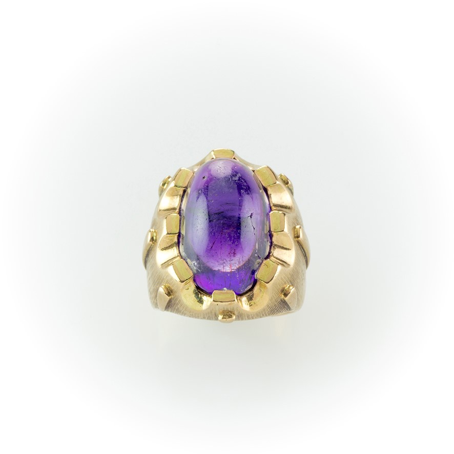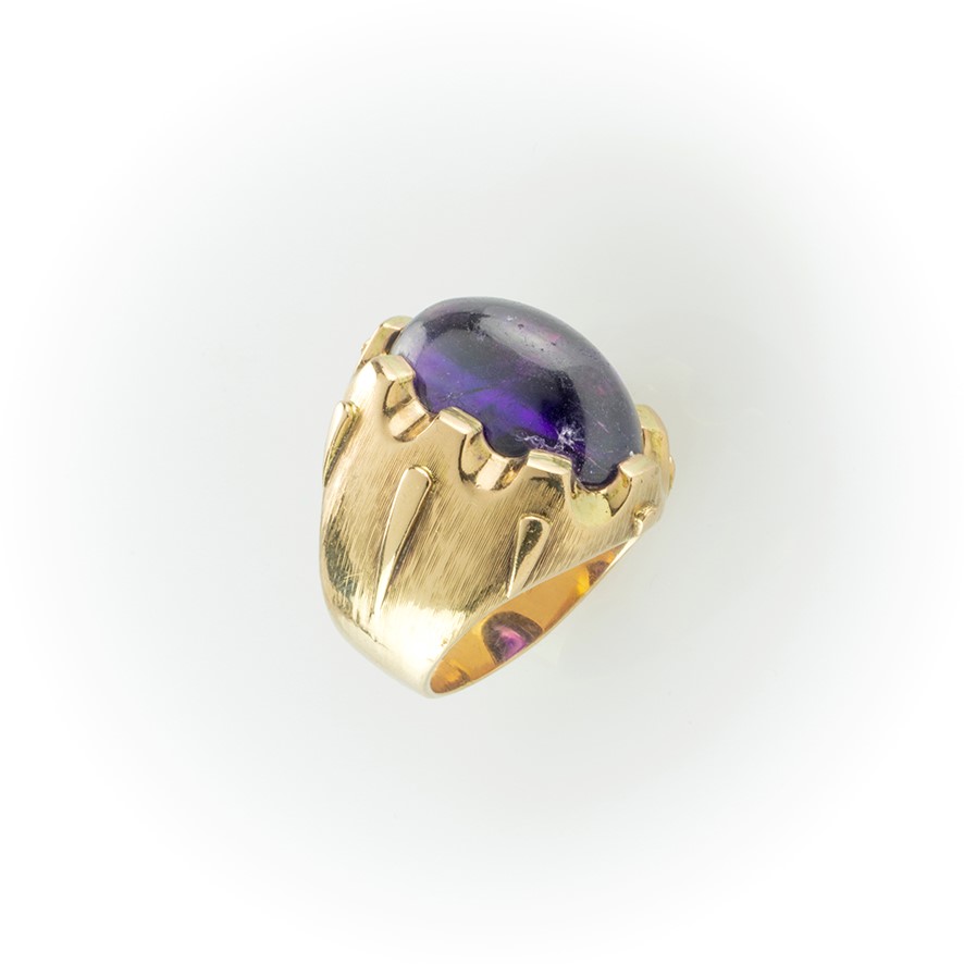 Anello del cardinale in oro giallo 14 kt e ametista ovale taglio cabochon
