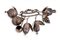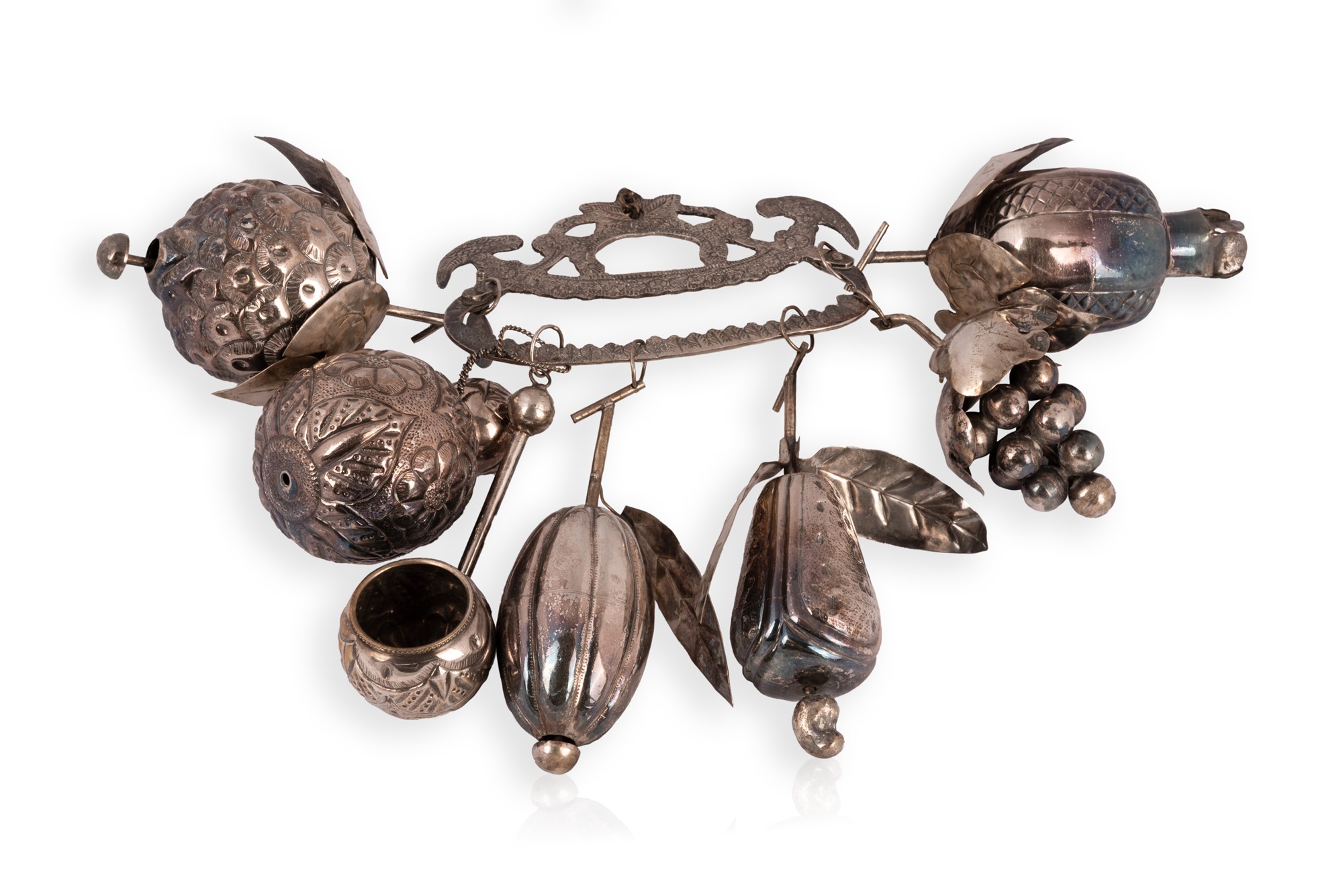 Elemento decorativo in metallo argentato composto da 7 frutti sostenuti da un manico cesellato con due pappagalli