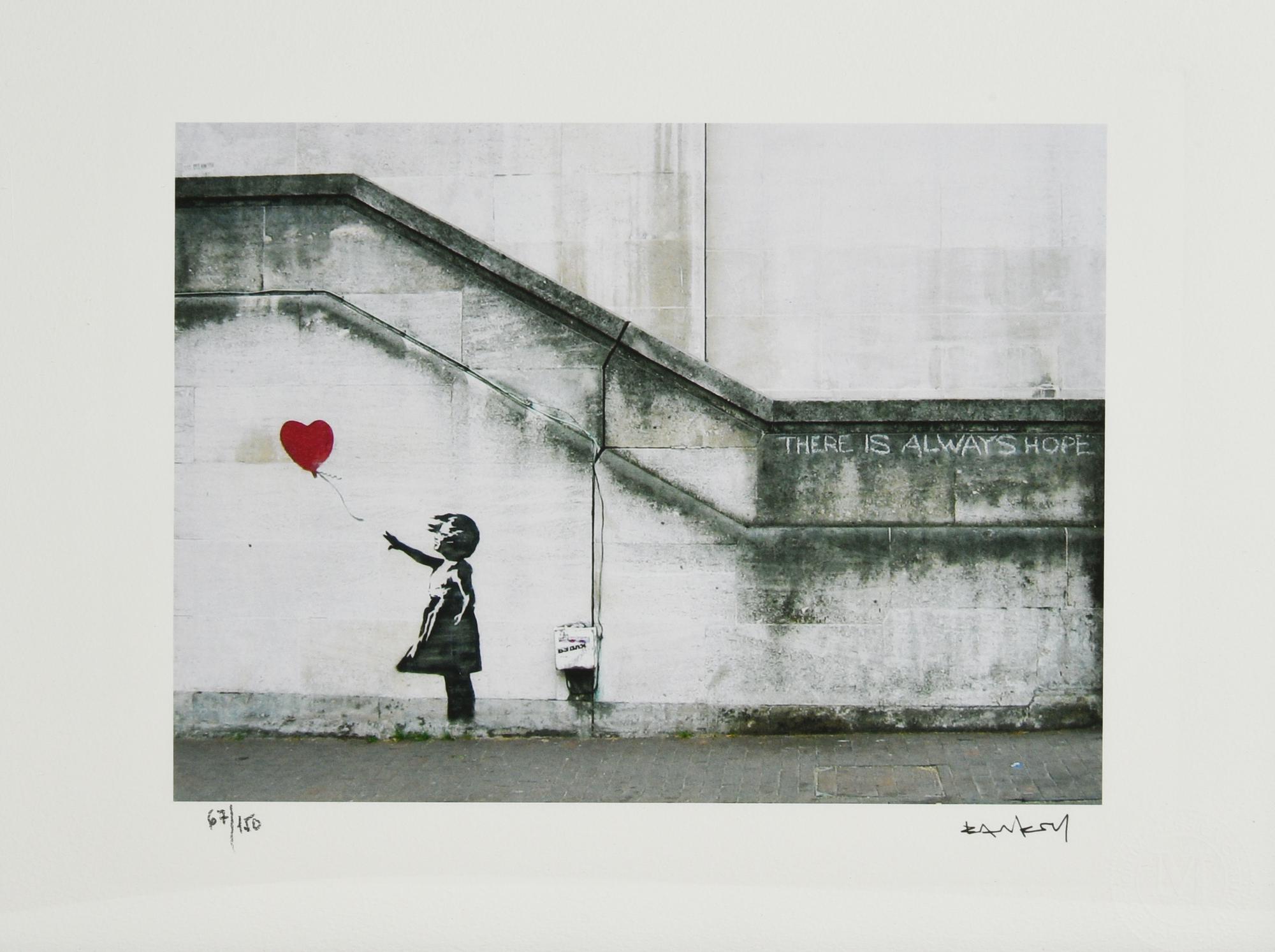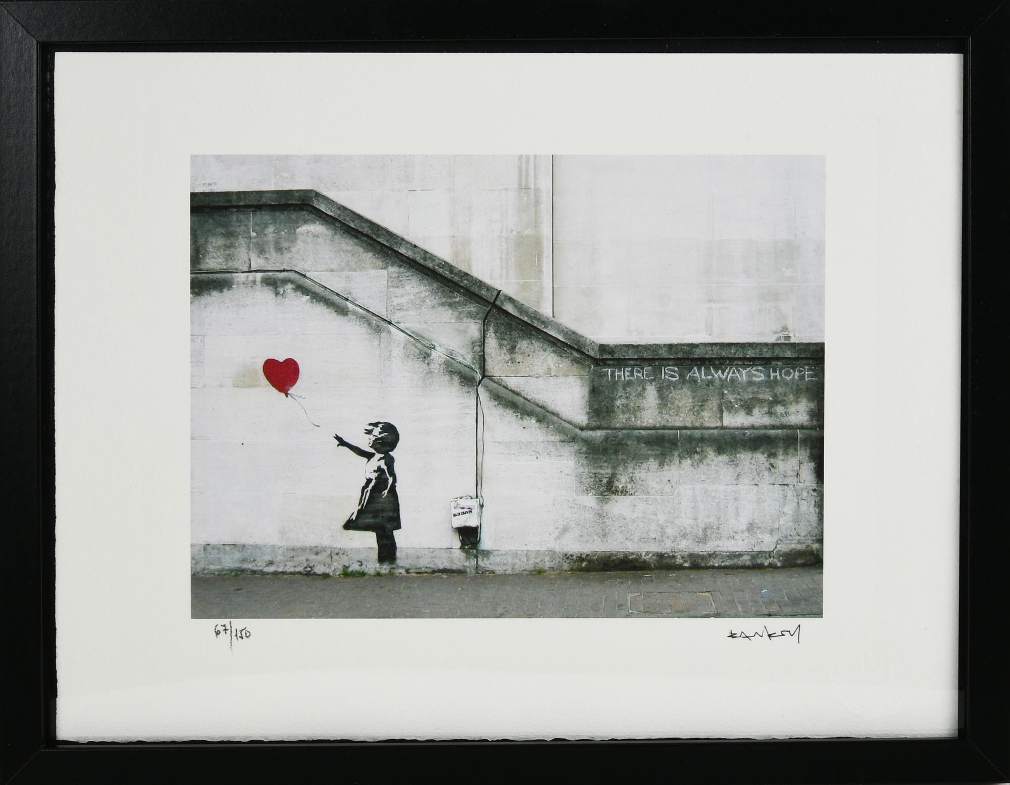 Da Banksy GIRL WITH BALLOON eliografia su carta, cm 28,5x38; es. 1/250 firma...