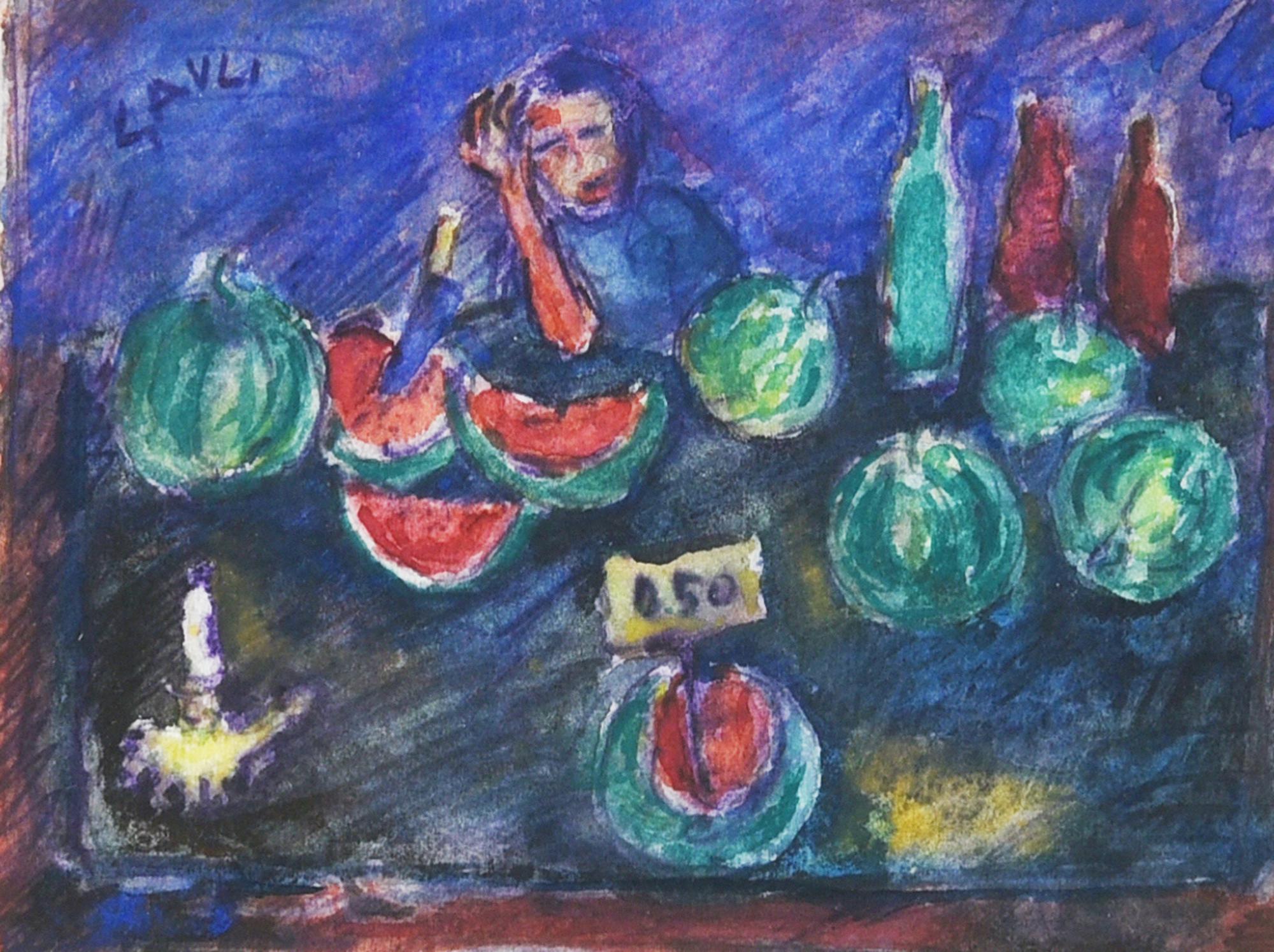 Piero Gauli VENDITORE DI ANGURIA acquerello su carta, cm 17,5x23,5 firma sul...