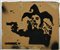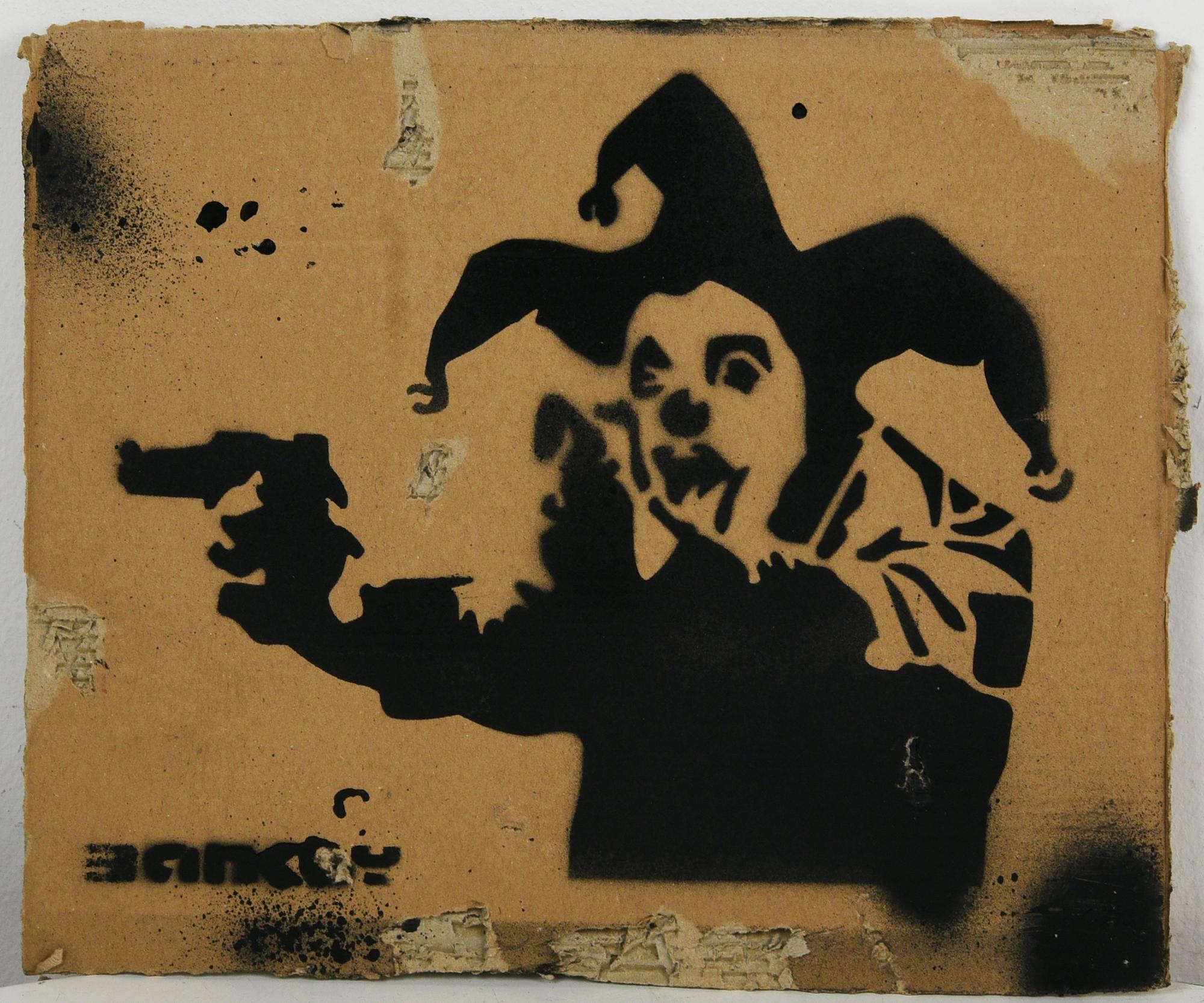 Banksy CLOWN WITH GUNS sprayed stencil graffiti su cartone, cm 24x29 sul...