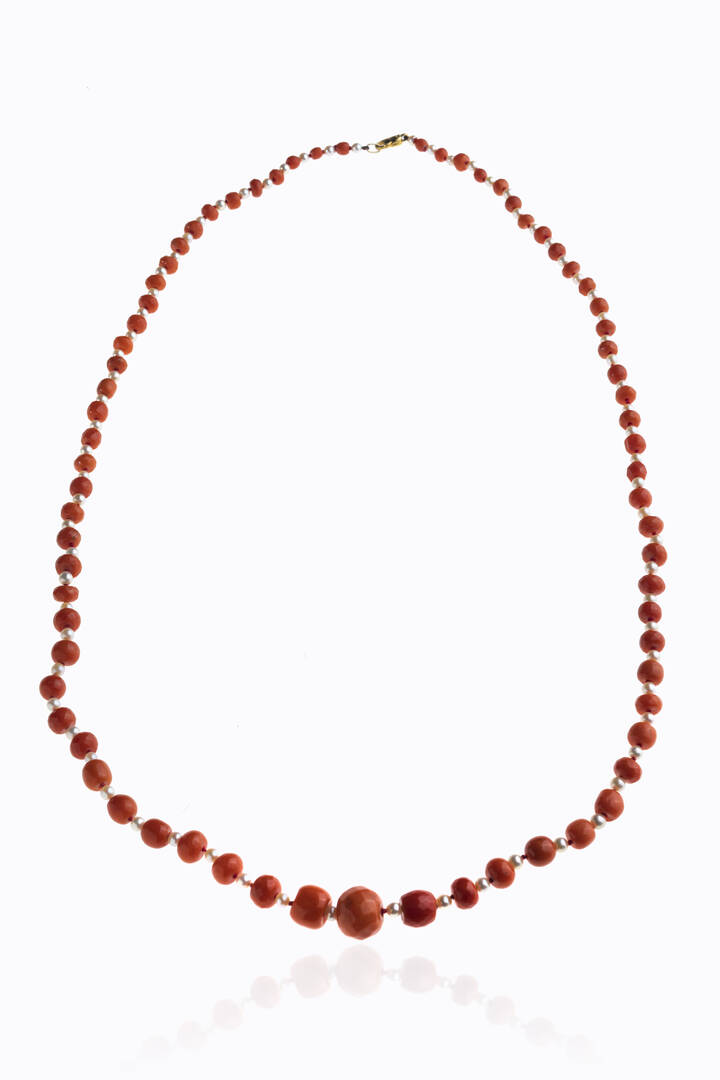 composta da barilotti sfaccettati a scalare di corallo mediterraneo dal diam. di mm14,2 a 5 ca, alternati a perline. Chiusura in oro giallo ad anello