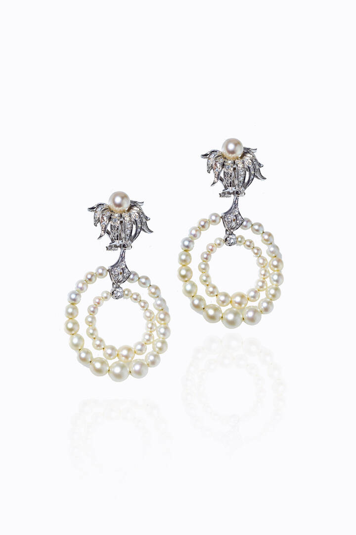 pendenti, con quattro cerchi concentrici composti da perline giapponesi a scalare. Diamanti taglio brillante e 8/8 per totali ct 0,80 ca