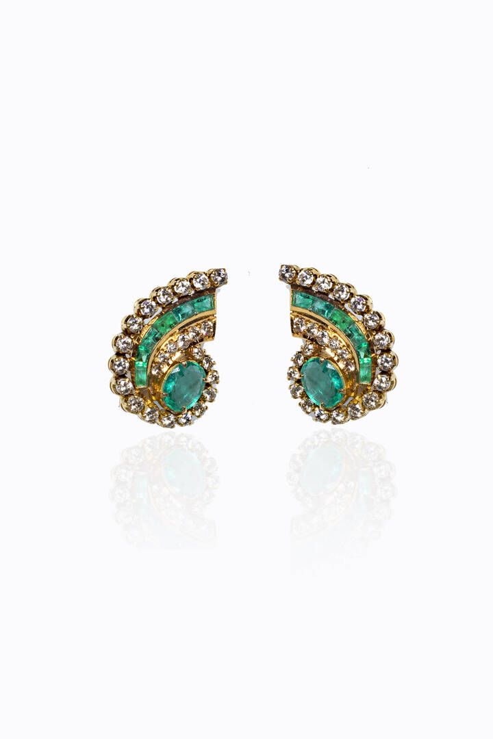 in oro giallo, a volute, con smeraldi taglio ovale e baguette per totali ct 3,0 e diamanti tagli brillante per totali ct 1,40 ca