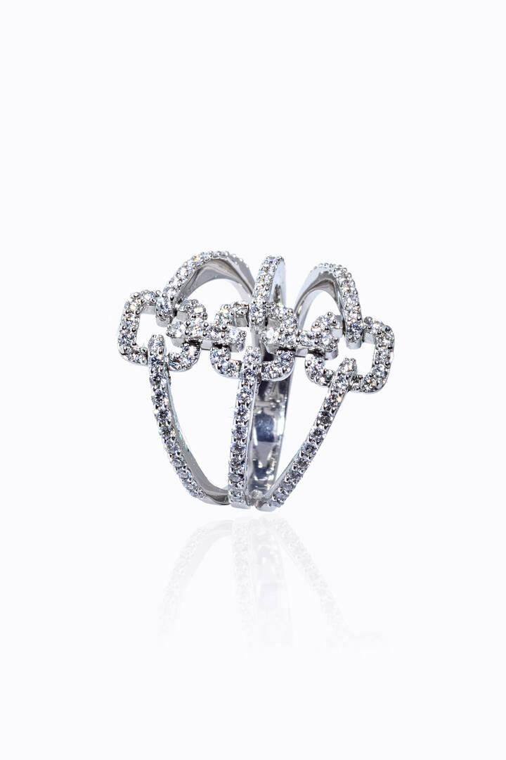 in oro bianco, sommità con tre fasce raccordate da tre quadrati in diamanti taglio brillante per totali ct 0,87 ca, probabile colore G-H, purezza IF-VVS