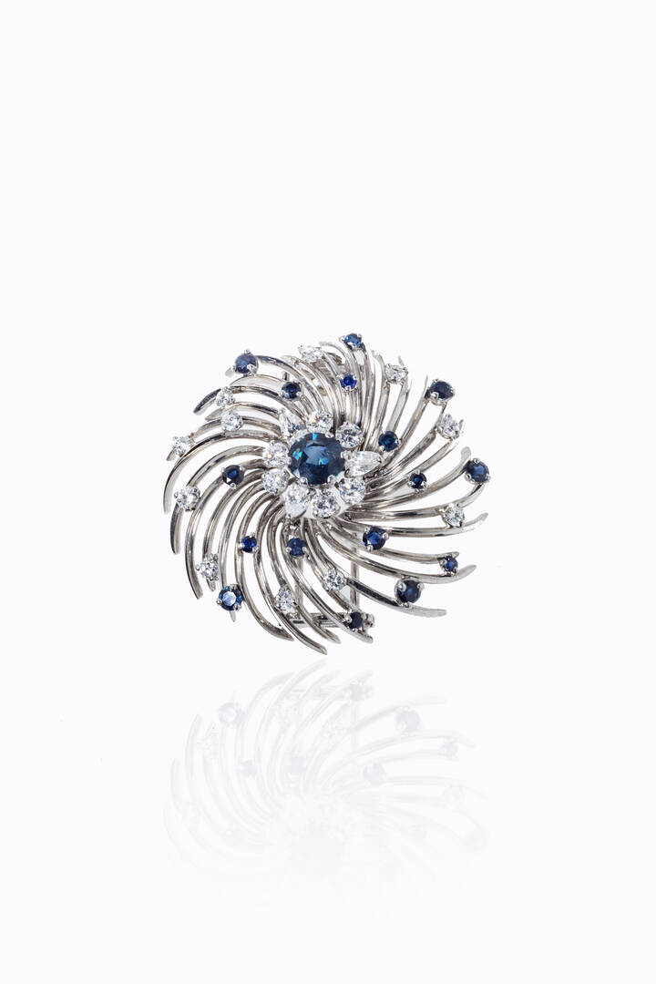 in oro platino, di forma rotonda, anni '50, con zaffiri taglio rotondo per totali ct 2,50 ca, diamanti taglio brillante e goccia per totali ct 1,90 ca
