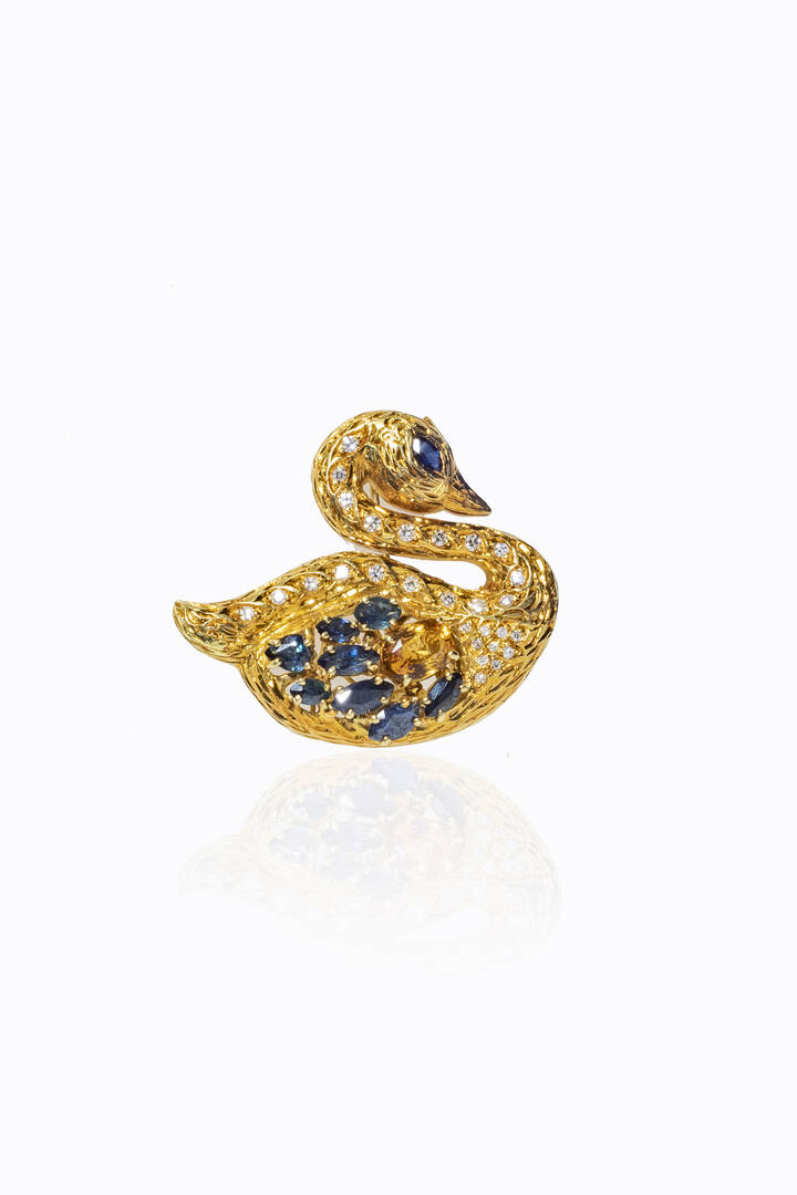 in oro giallo, a forma di cigno, con zaffiri taglio navette per totali ct 2,50 ca, un quarzo citrino e diamanti taglio 8/8 per totali ct 0,55 ca