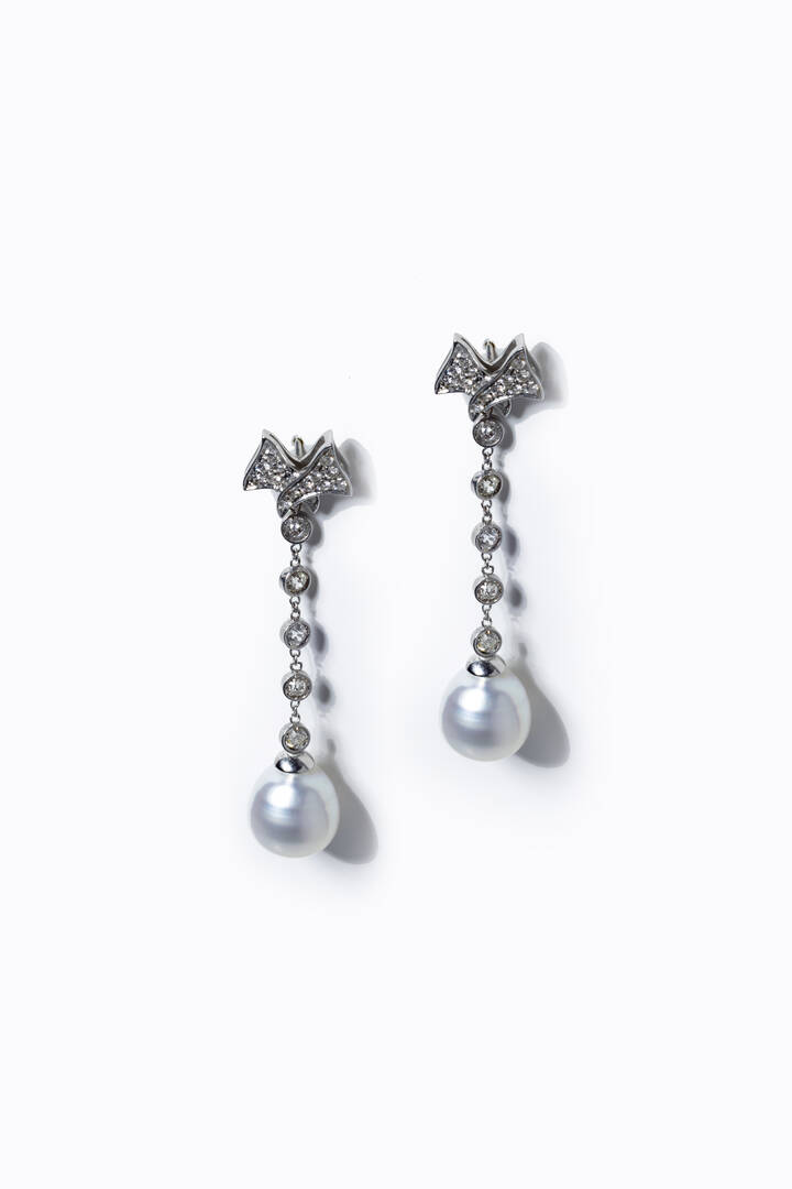 pendenti, in oro bianco, con intreccio ai lobi in pavé di diamanti taglio brillante e baguette lungo il corpo per totali ct 2,0 ca, terminanti con due perle australiane scaramazze