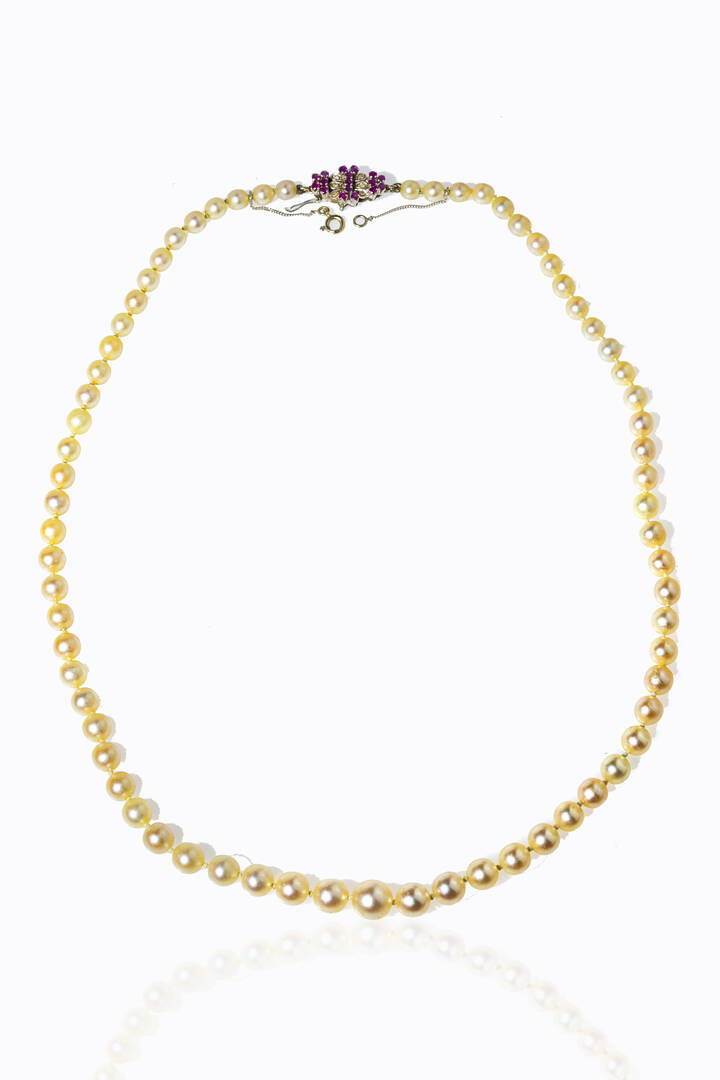 composta da un filo di perle giapponesi a scalare dal diam. di mm 5,5 a 8,8. Chiusura in oro bianco con rubini taglio rotondo