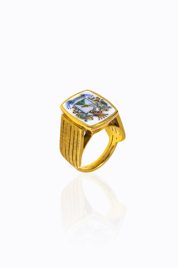 Chevalier in oro giallo, attribuibile alla maison "Repossi"; gambo satinato; sommità recante stemma nobiliare in smalto