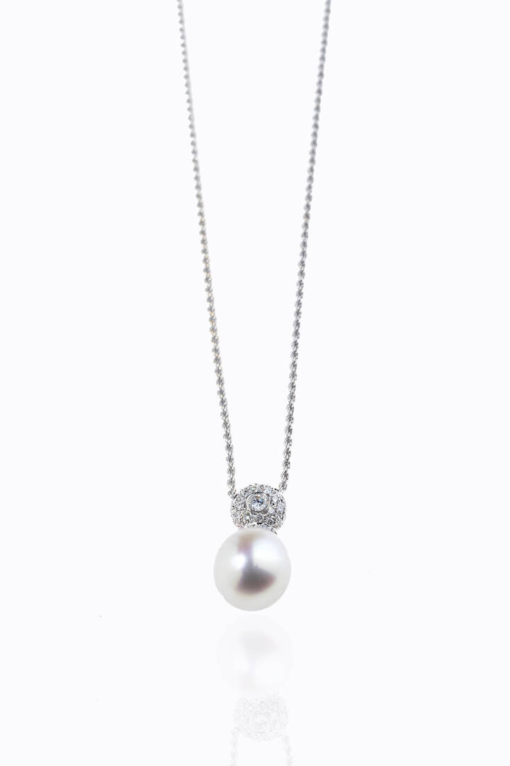 in oro bianco, con semisfera in diamanti taglio brillante per totali ct 0,25 ca, terminante con perla australiana a pera di mm 10 ca