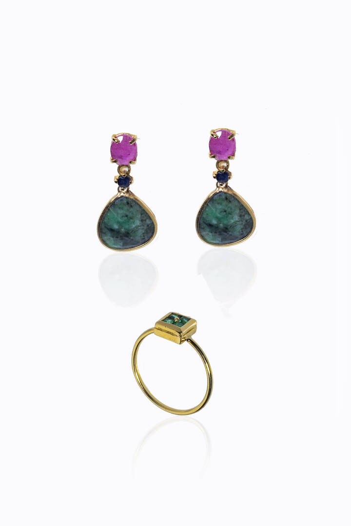 -coppia di orecchini in oro 9 Kt con gocce di agata verde pendenti e pietre rosa. Peso gr 4,1