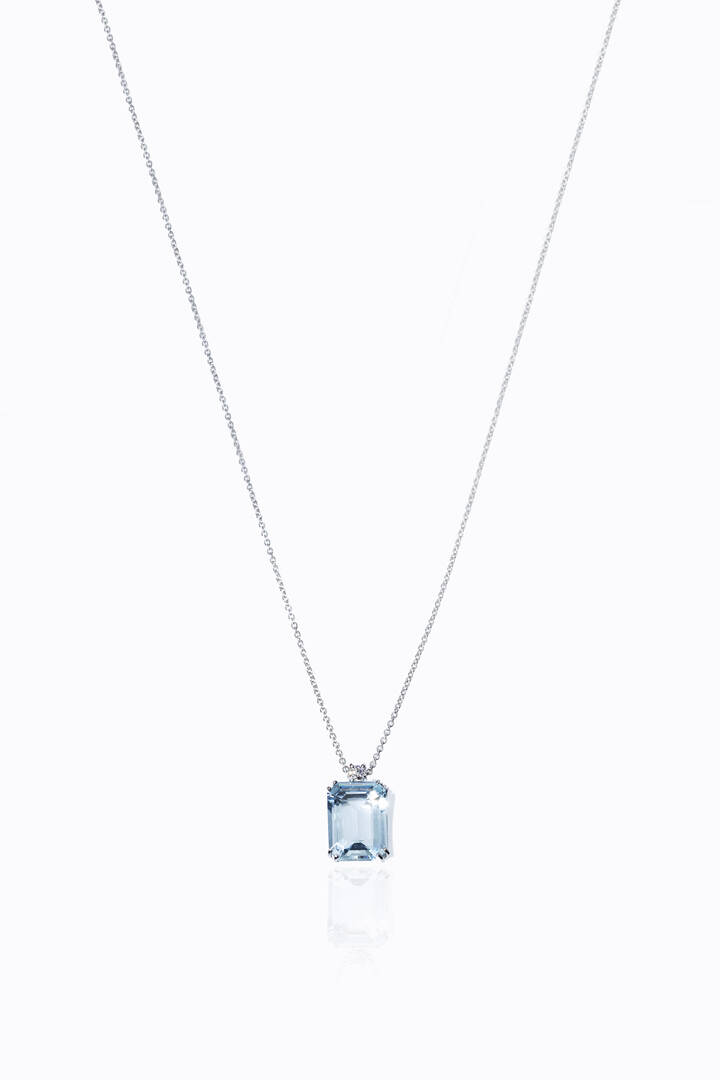 in oro bianco con acquamarina taglio ottagonale a gradini di ct 2,09 ca, sormontata da diamante taglio brillante di ct 0,03