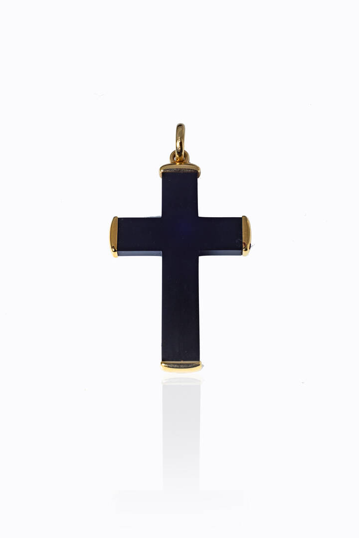 Grande ciondolo a forma di croce, firmato "Pomellato", modello "Victoria" con braccia in onice e terminali in oro giallo