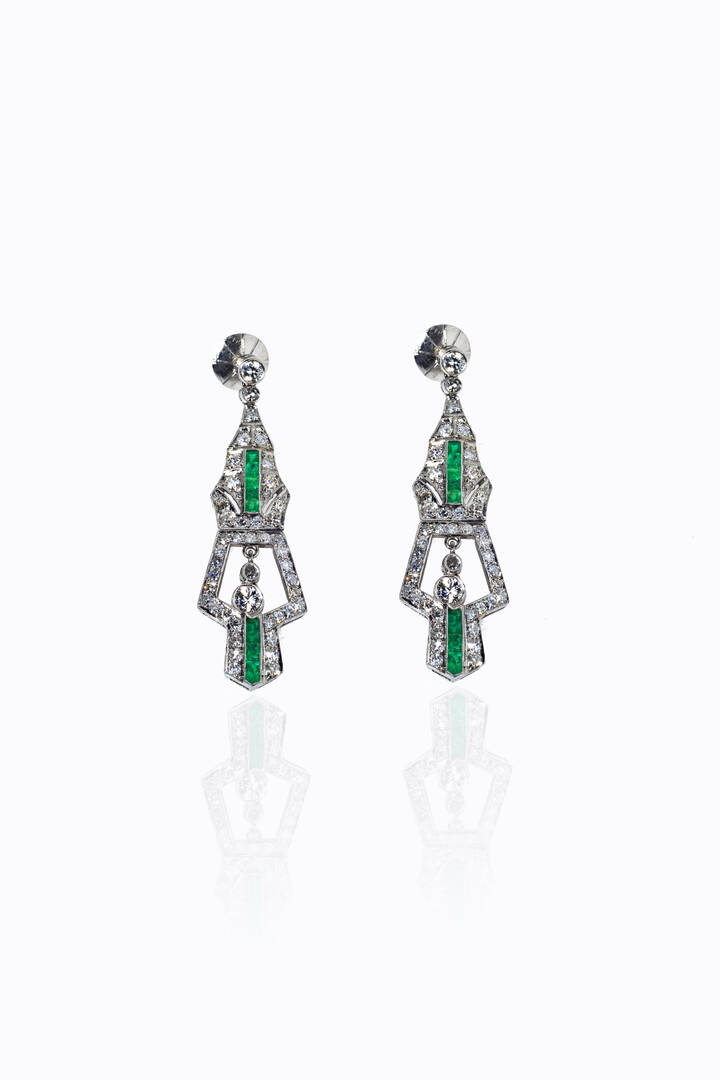 in platino, in stile anni '20, di forma geometrica, con smeraldi taglio carré per totali ct 0,60 ca e diamanti taglio brillante e 8/8 per totali ct 1,50 ca