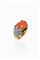 in oro giallo, sommità con corallo color salmone cabochon trattenuto da griffes a fiore in diamanti taglio brillante per totali ct 3,50 ca; inserti in onice a decoro