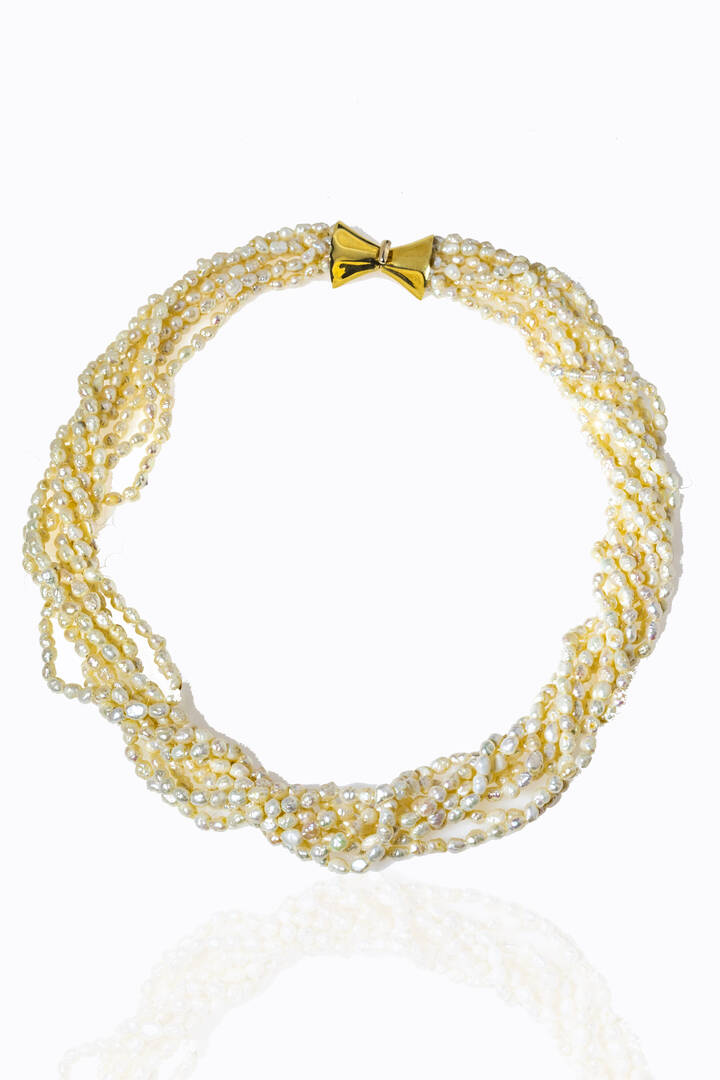 composta da otto fili di perle di acqua dolce. Chiusura in oro giallo a fiocco