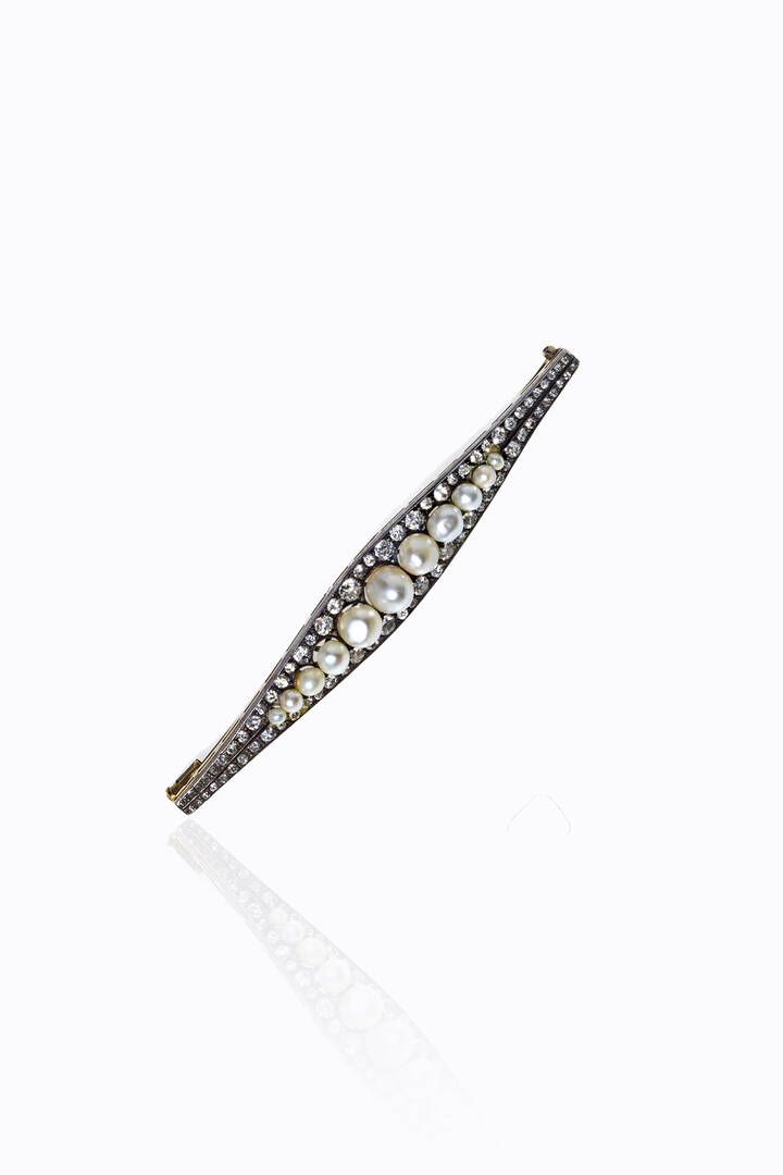 in oro a bassa caratura ed argento, a barretta, XIX secolo, con perle centrali e diamanti di vecchio taglio per totali ct 1,50 ca