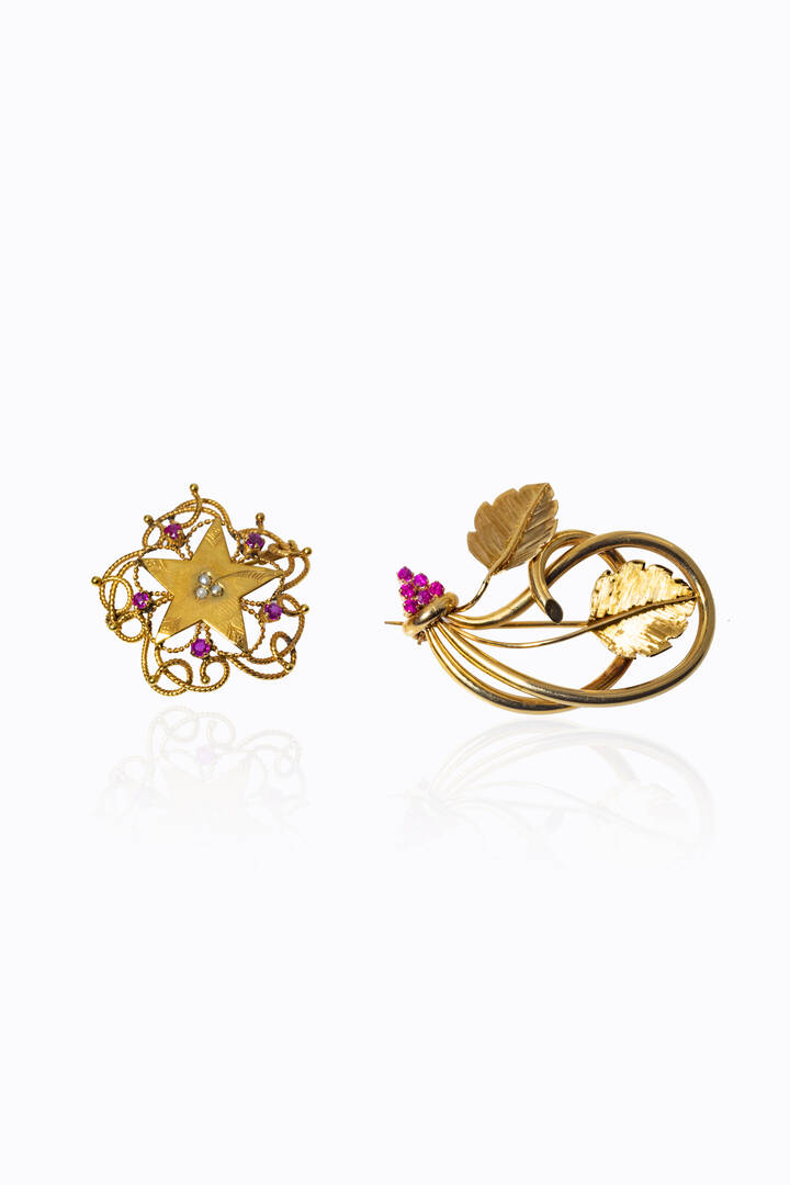 - a forma di stella con decori a corda e piccoli rubini. Peso gr 6,3. Diam. cm 3