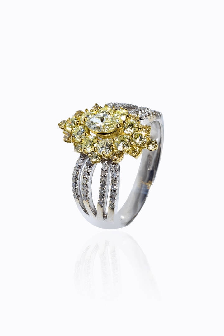 in oro bianco e giallo, al centro diamante taglio navette di ct 0,50 ca e contorno di diamanti taglio brillante e 8/8 di colore giallo e bianco per totali ct 1,45 ca