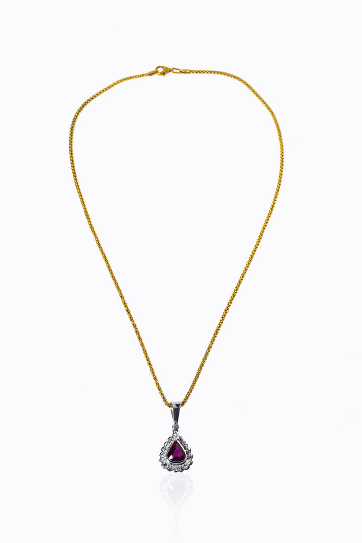 in oro giallo e bianco con rubino taglio a goccia di ct 1,30 ca e contornato da diamanti taglio brillante per totali ct 0,55 ca