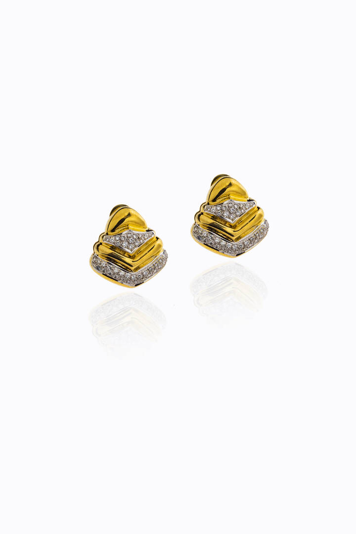 in oro giallo e bianco, a lobo, a forma di triangoli bombati e lavorati con diamanti taglio brillante per totali ct 0,80 ca
