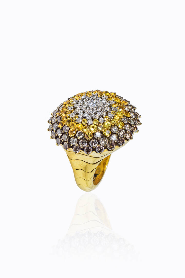 in oro giallo, sommità rotonda con file di diamanti taglio brillante di colore bianco e brown per totali ct 2,96 ca, probabile colore G-H, purezza IF-VVS; file di zaffiri gialli per totali ct 1,56 ca