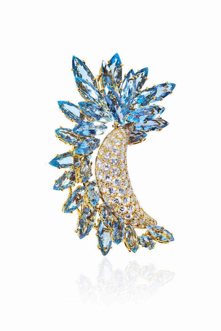 Grande spilla in oro giallo, firmata "Faraone", di forma fantasia con diamanti taglio brillante per totali ct 4,50 ca e acquamarine taglio navette per totali ct 35 ca