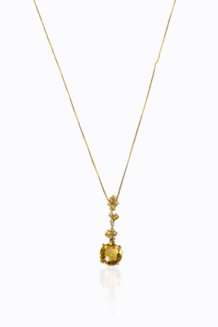 Catena con ciondolo in oro giallo, firmato "Miluna", con quarzi citrini sfaccettati e piccoli diamanti taglio brillante per totali ct 0,07 ca