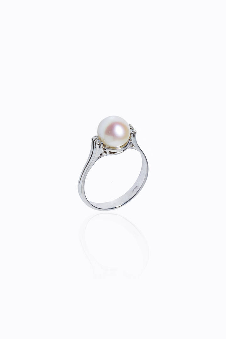 in oro bianco con perla giapponese del diam. di mm 7,7 e quattro diamantini ai lati taglio 8/8 per totali ct 0,05 ca